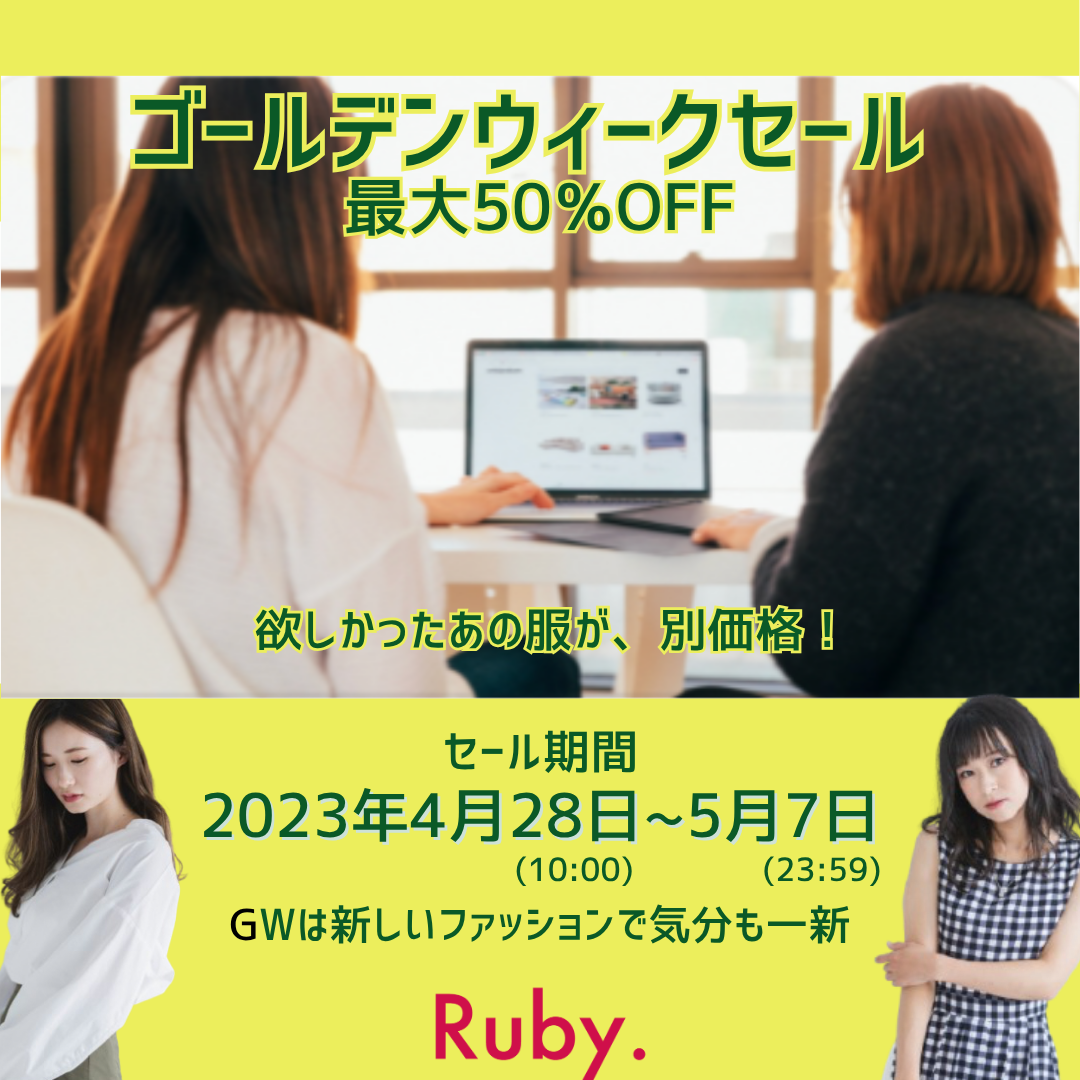 ターゲットはトレンドを取り入れた女性らしさがあるお洋服が欲しいとのことなので、キャッチコピーでは、「ゴールデンウィークセール」「最大50%OFF」「セール期間:2023年4月28日〜5月7日」というコピーで表現しました。