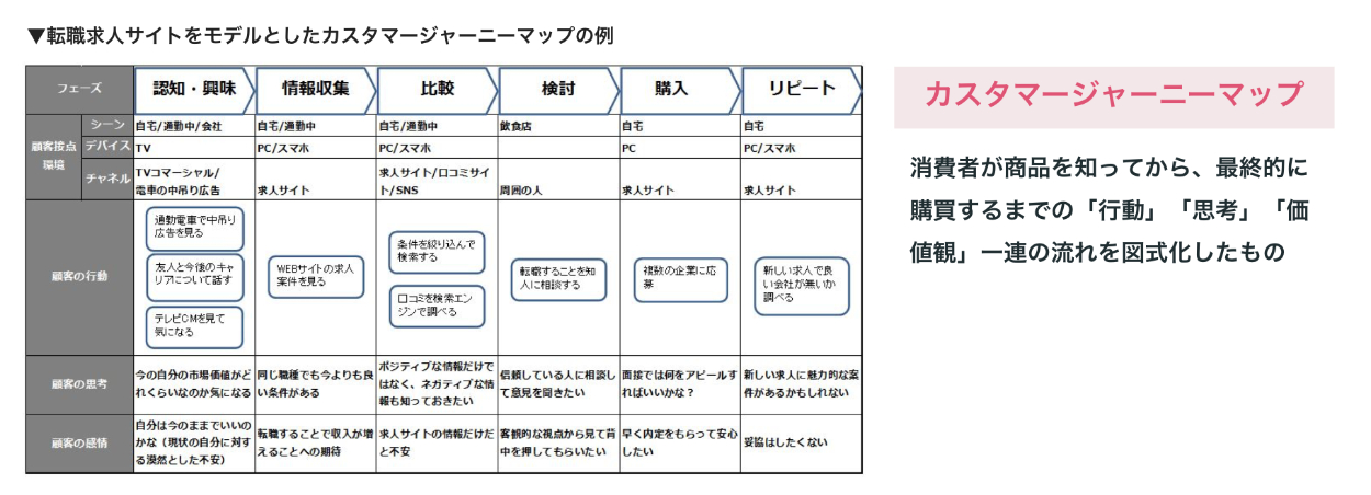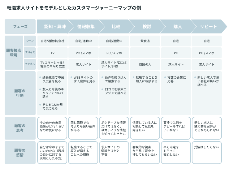「▼転職求人サイトをモデルとしたカスタマージャーニーマップの例」