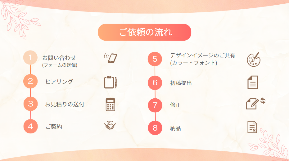 - 「ご依頼の流れ」(3ページ目)では、番号をふり、番号にグラデーションを施して、お問い合わせから納品までを円滑に読み進められるように工夫しました。
