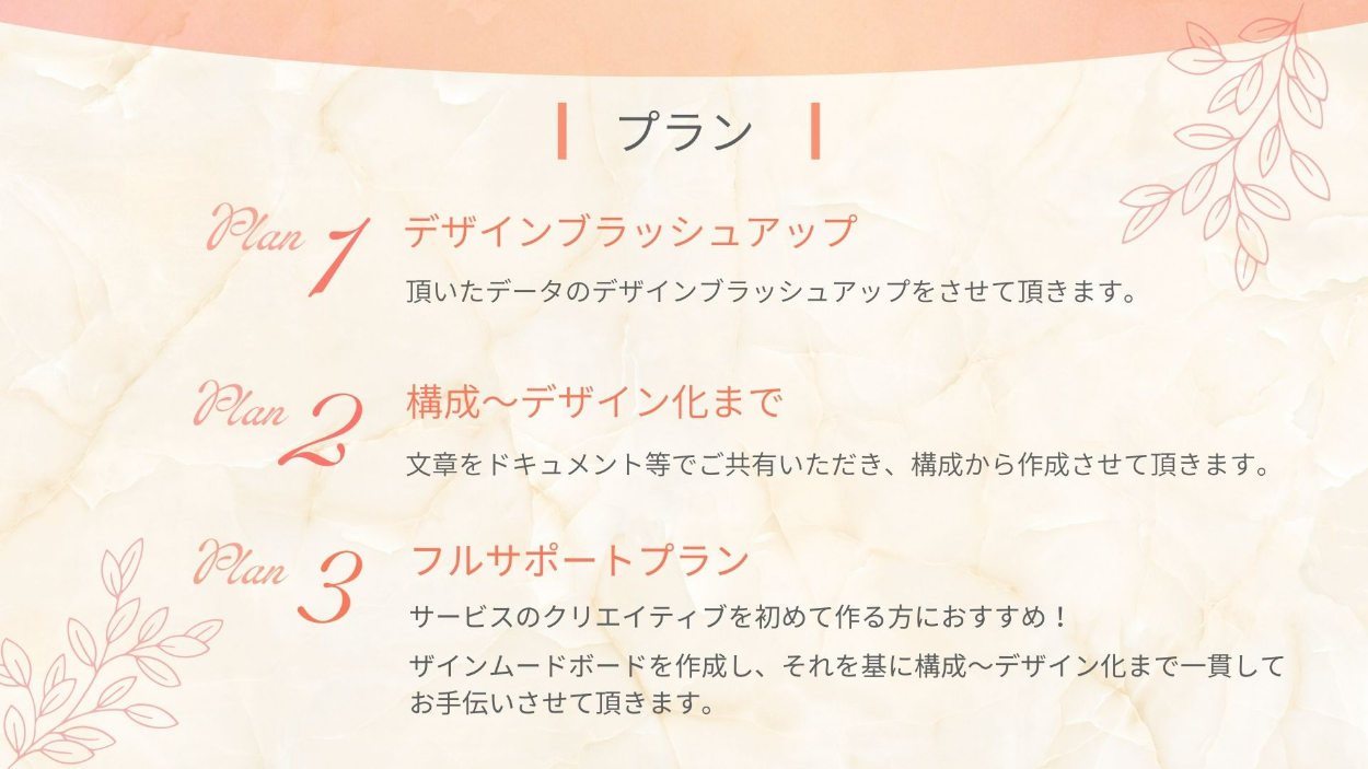 - 「プラン」(4ページ目)では見出しと説明文とのジャンプ率を高めにして視認性を高めました。