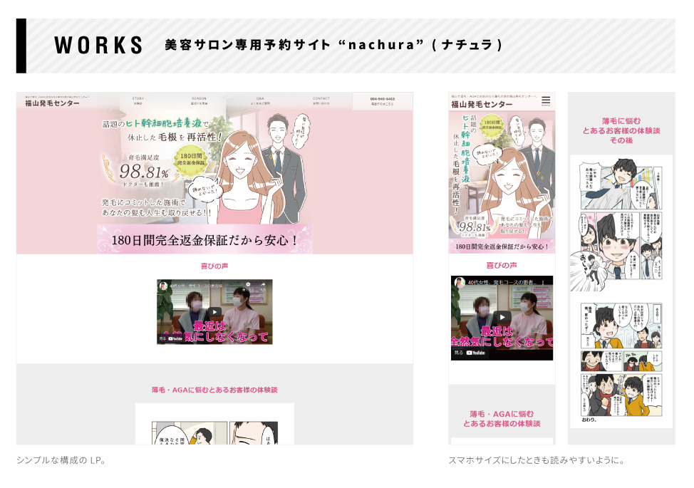 デザイン・コーディングだけでなく、絵を描けるのが私の強みです。今後も積極的にサイト制作に活用していきたいです。このLPに関してはデザインの改善余地は沢山あると思っています。常にクオリティを高く保てるように、参考に引っ張られないデザインを心掛けたいです。