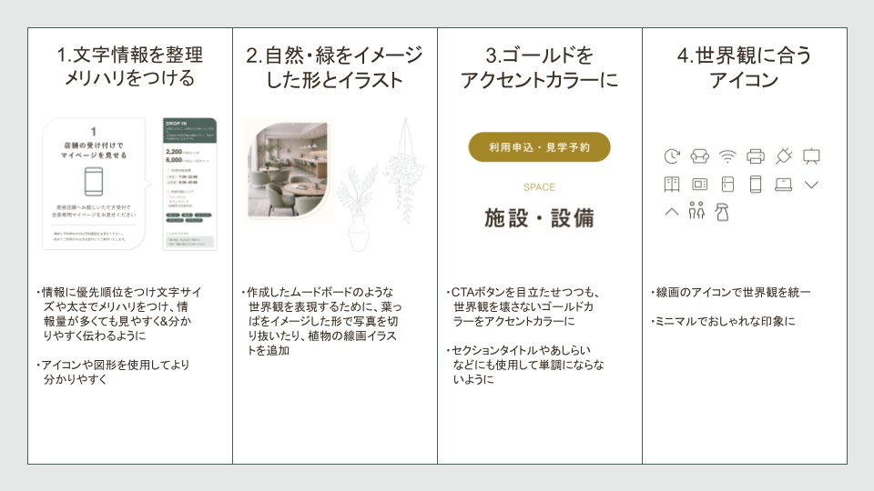 ・リサーチをしっかり行うことで、一つ一つの要素に対して「なぜこうしたのか?」という理由を明確にしながら制作を進めることができた。