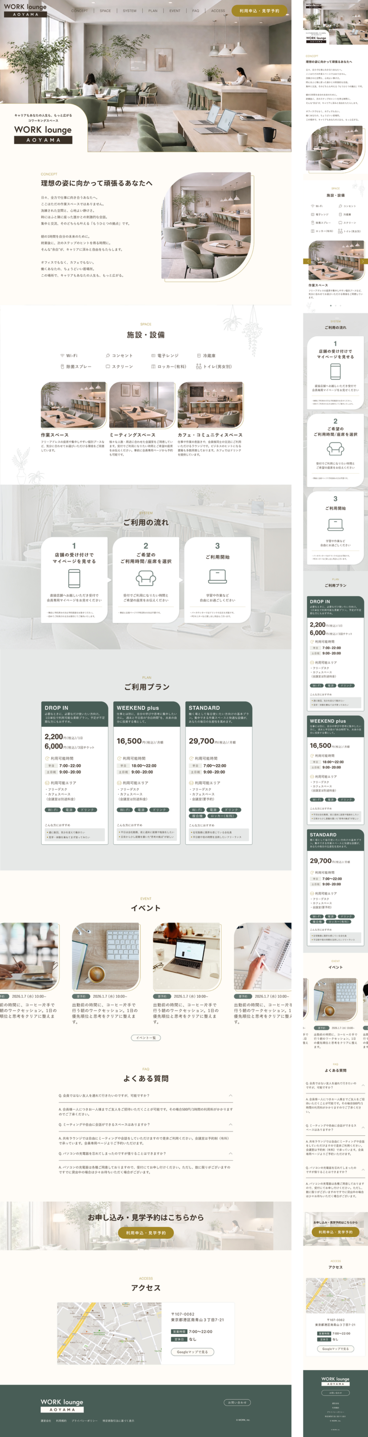 SHE likes PROデザイナーコースの課題で、コワーキングスペース「WORK lounge AOYAMA」のLPを作成しました。 使用ツール:Figma / Photoshop 制作期間:2週間 制作時間:要件定義・リサーチ:6時間 /WF:3時間 / デザイン:16時間