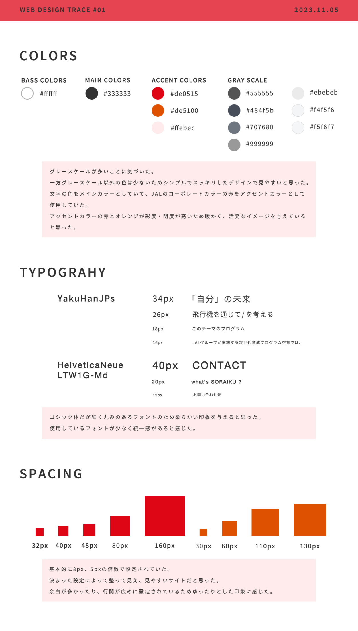 サイトで使用されているタイトルや本文のフォントサイズ、セクション間や文章間の余白がどのくらい取られているのかを分析し、なぜこのサイトが綺麗に見えるのかを考えながら取り組みました。