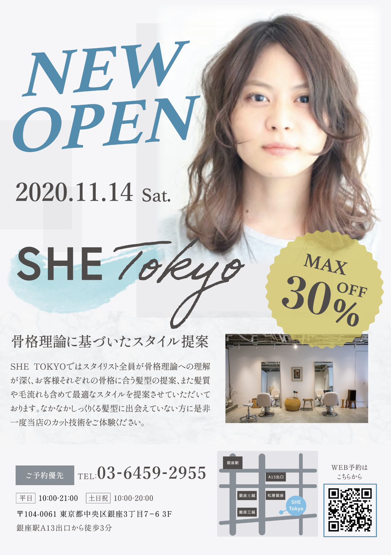QRコードでHPやネット予約を手軽にできるようにし、キャッシュレス決済のアイコンなども掲載しよりパッと見てわかるようにデザインしました。