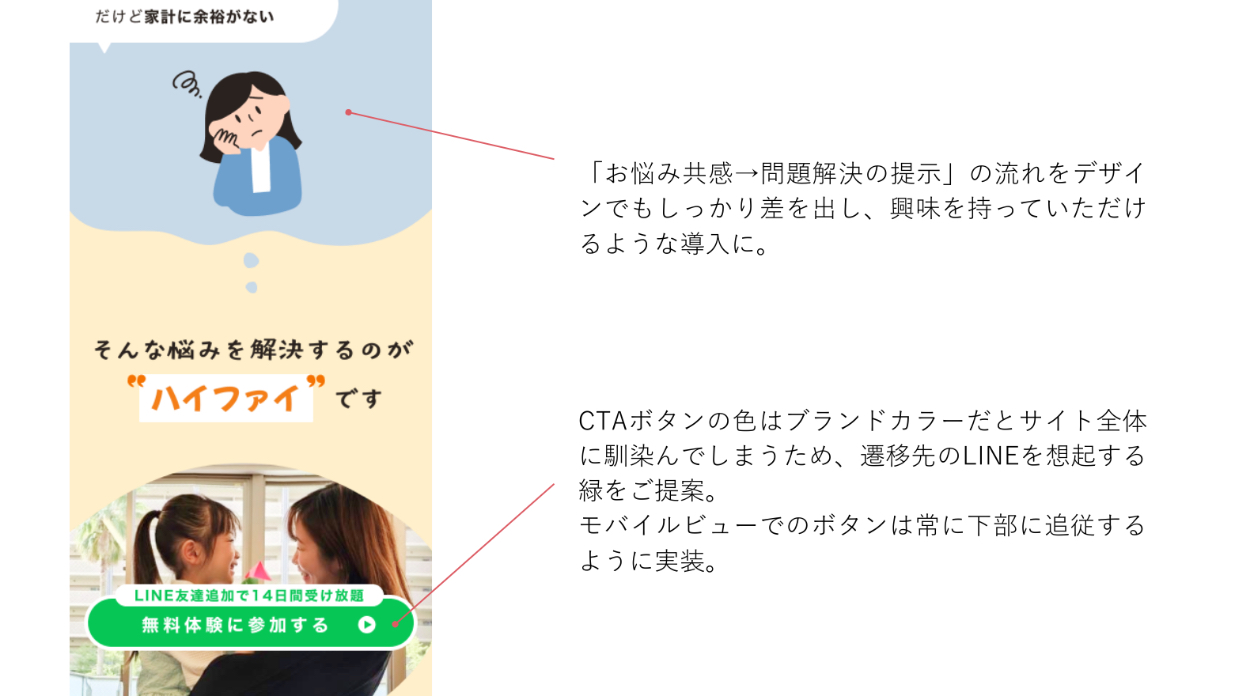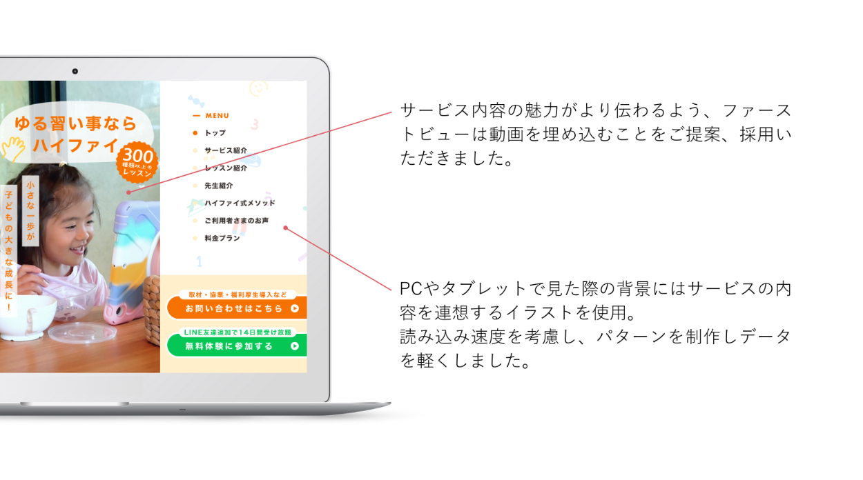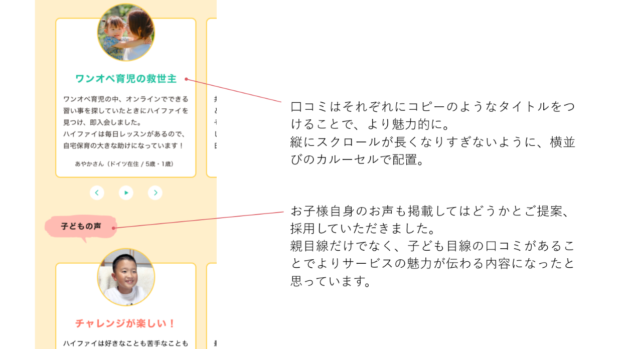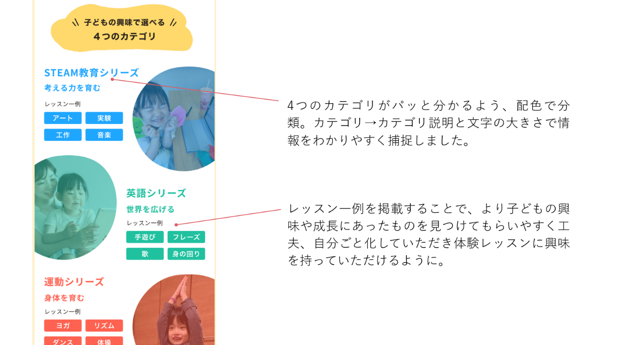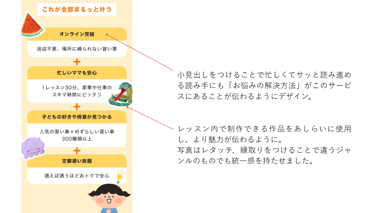 全体を通して、子どもの「やってみたい!」「できた!」がこのサービスを使うことで叶えられると読み手が感じられるよう、魅力がしっかり伝わるようデザインしました。