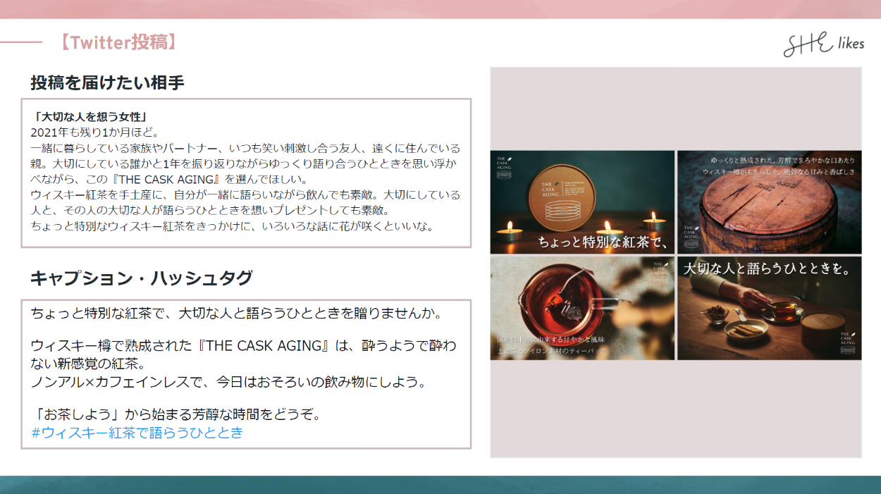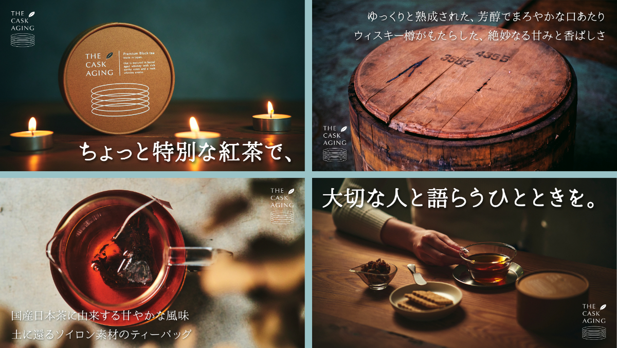 プレミアム紅茶「THE CASK AGING」を誰かに贈りたくなるよう訴求する投稿作成(バナー&キャプション・ハッシュタグ)。