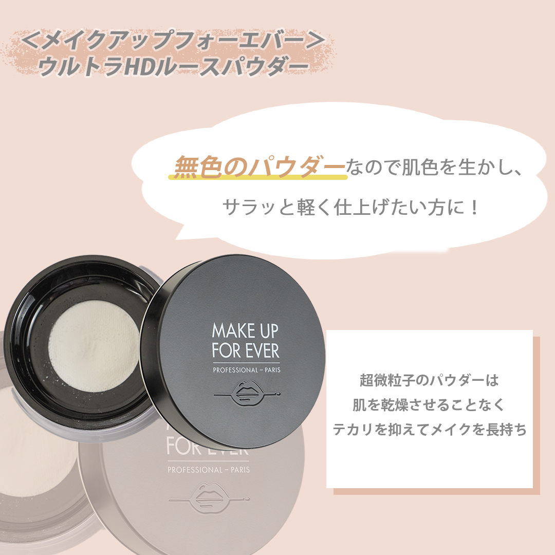「ウルトラHDルースパウダー」はスウォッチがありませんが、2〜3枚目と同じ見え方になるようデザインを工夫しました。