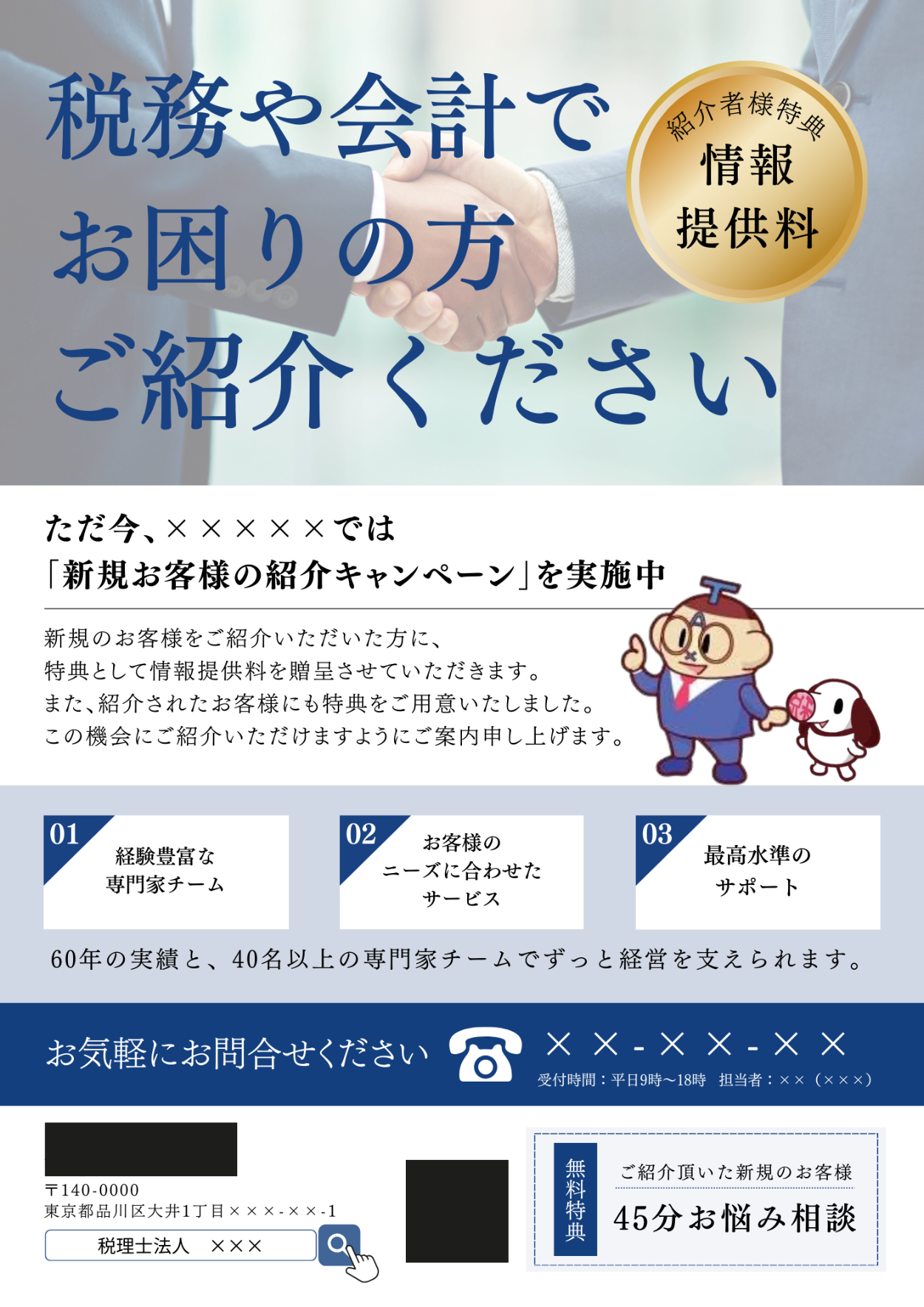 - 一番の訴求ポイントである「税務や会計でお困りの方ご紹介ください」を目立たせました。