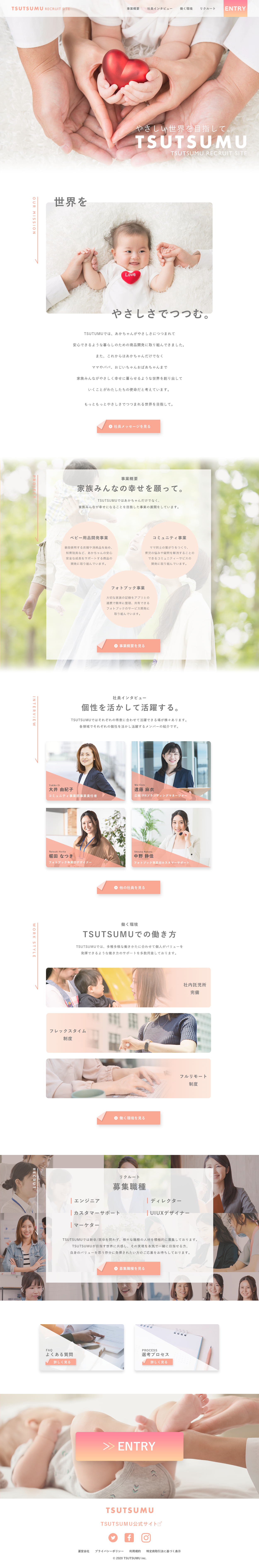 メインビジュアルを特に拘りました。メインビジュアルはLPを見た時に一番初めに見える部分となる為、TSUTSUMUの世界観や伝わってくるような写真選びをしました。事業内容として、ベビー用品を扱うだけではなく、お母さんやお父さん達のコミュニティ事業等も行なっているため、あえて赤ちゃんだけの写真ではなく、家族がTSUTSUMUによって優しく包まれているような、そんなイメージとが伝わるようにしました。また、キャッチフレーズも置くことで、より会社のカルチャーや目標がはっきりわかるようにしています。