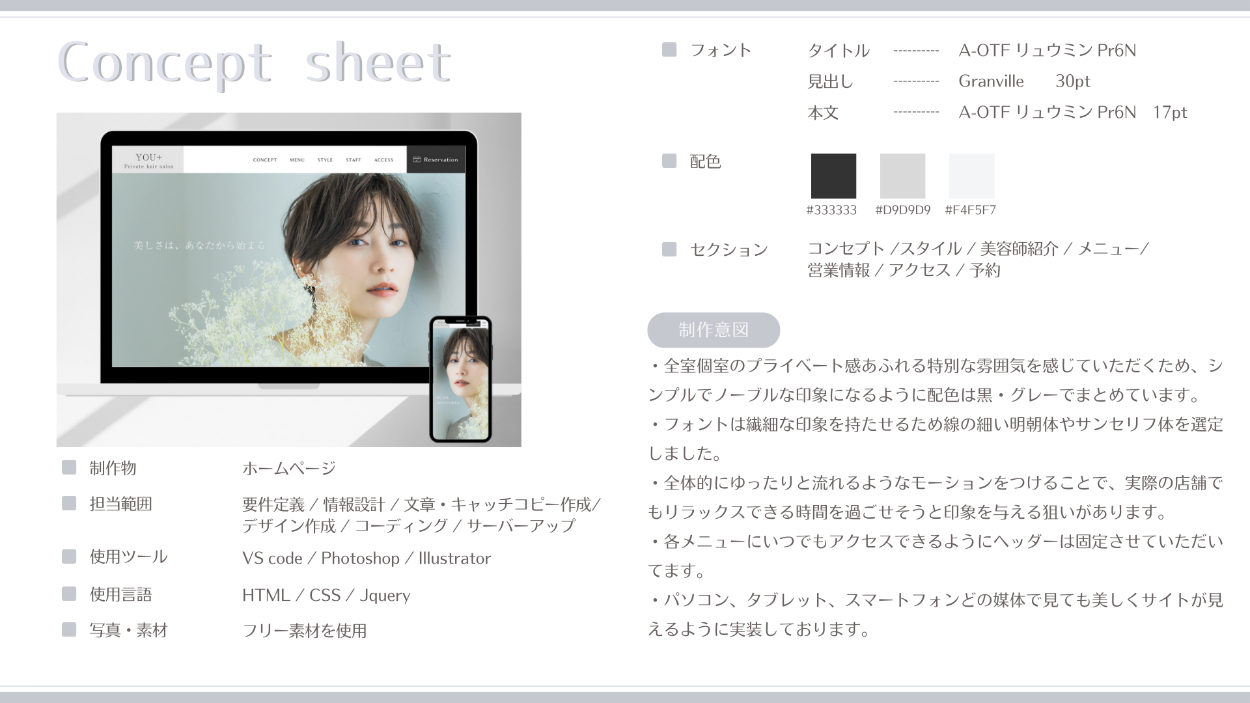 美容室のコンセプトであるマンツーマン施術のリッチ感、プライベートな個室空間でのリラックス感、お客様の髪質に合った施術の提供が行われるスペシャリスト感をフォント、余白、イメージ画像を使用して表現しました。