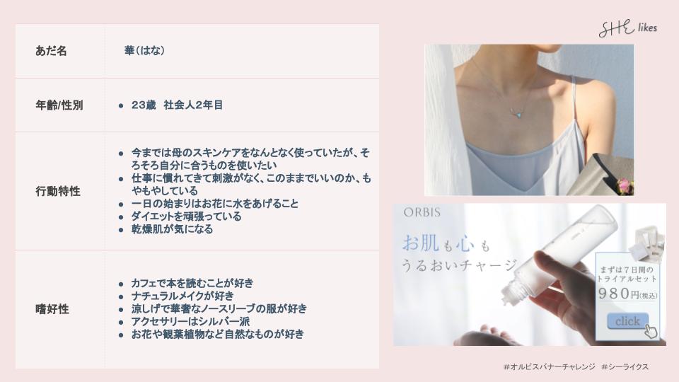 ORBIS様のバナーコンペに参加しました。ペルソナに合ったバナー制作を心がけ、採用に至りました。【使用ツール】Photoshop【制作時間】5h