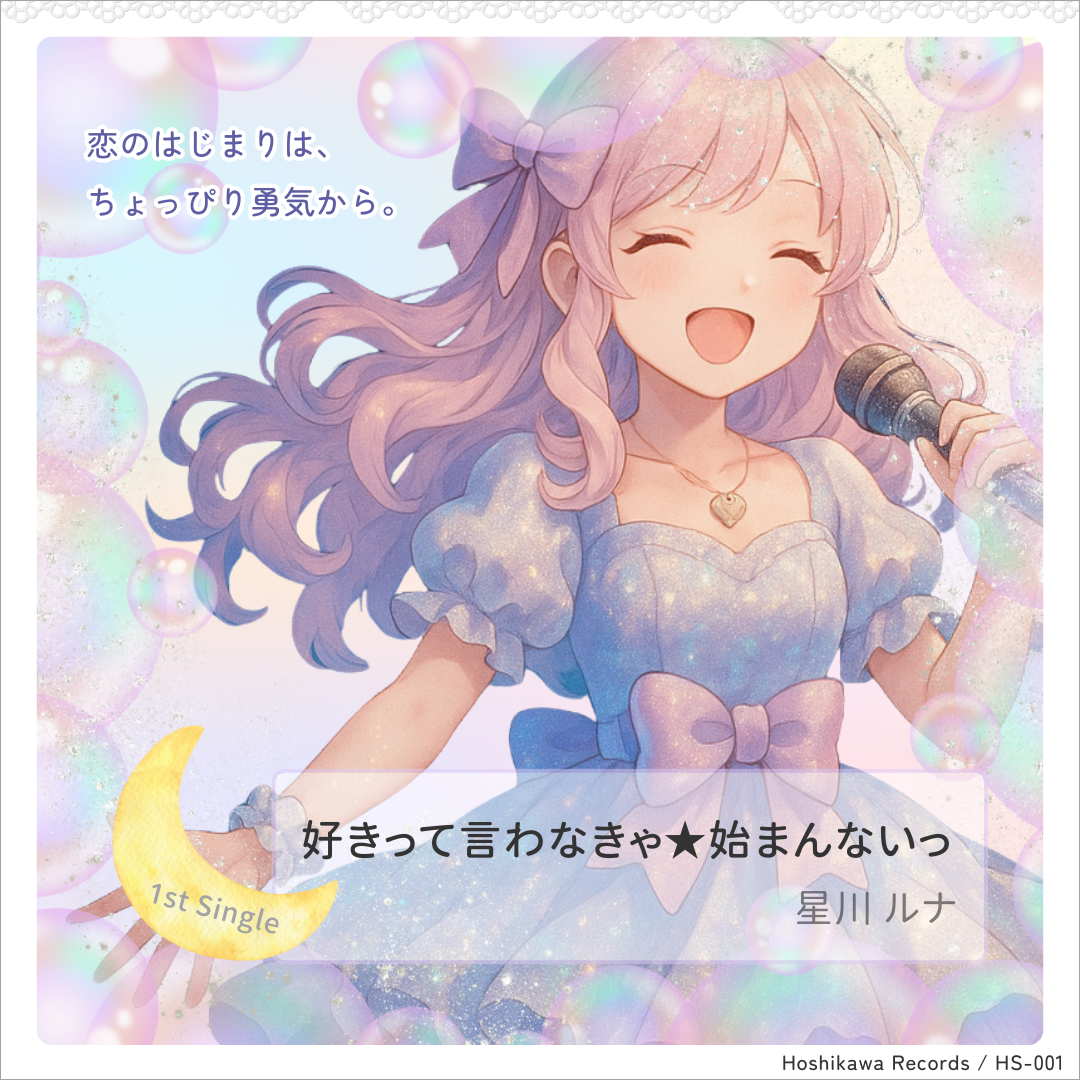 オリジナル楽曲「好きって言わなきゃ★始まんないっ」の世界観を表現したCDジャケット風デザインを作成しました。夢かわいいテイストとアイドルらしい爽やかさを組み合わせ、恋のはじまりのきらめきを可視化しています。