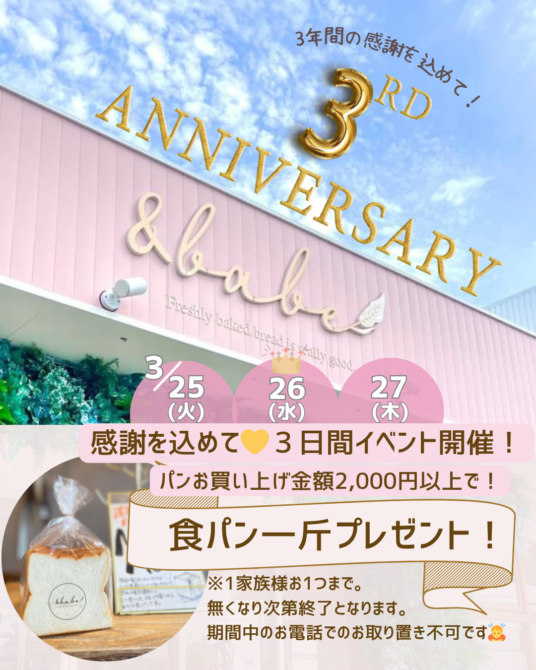 (3日間パンのお買い上げ金額2,000円以上で食パン一斤プレゼント)という店内イベントの宣伝を行う。