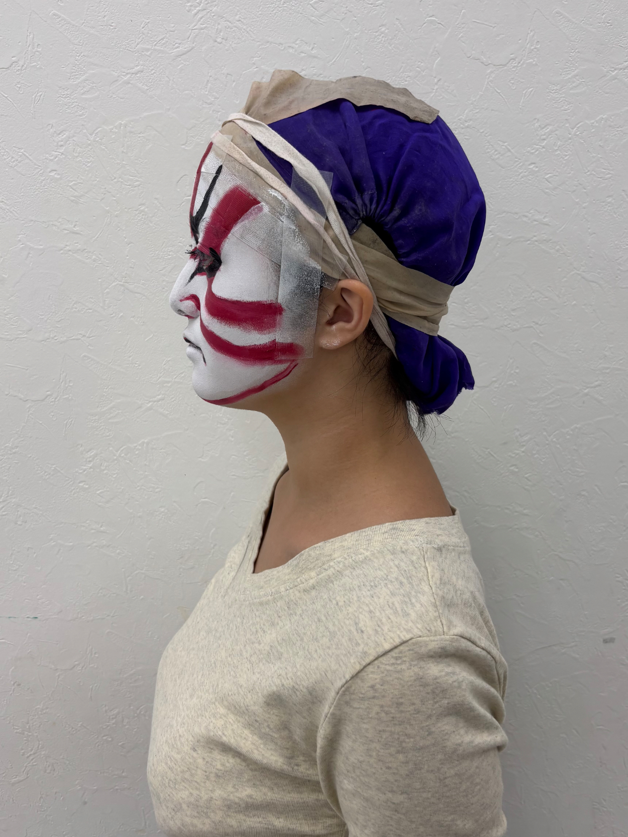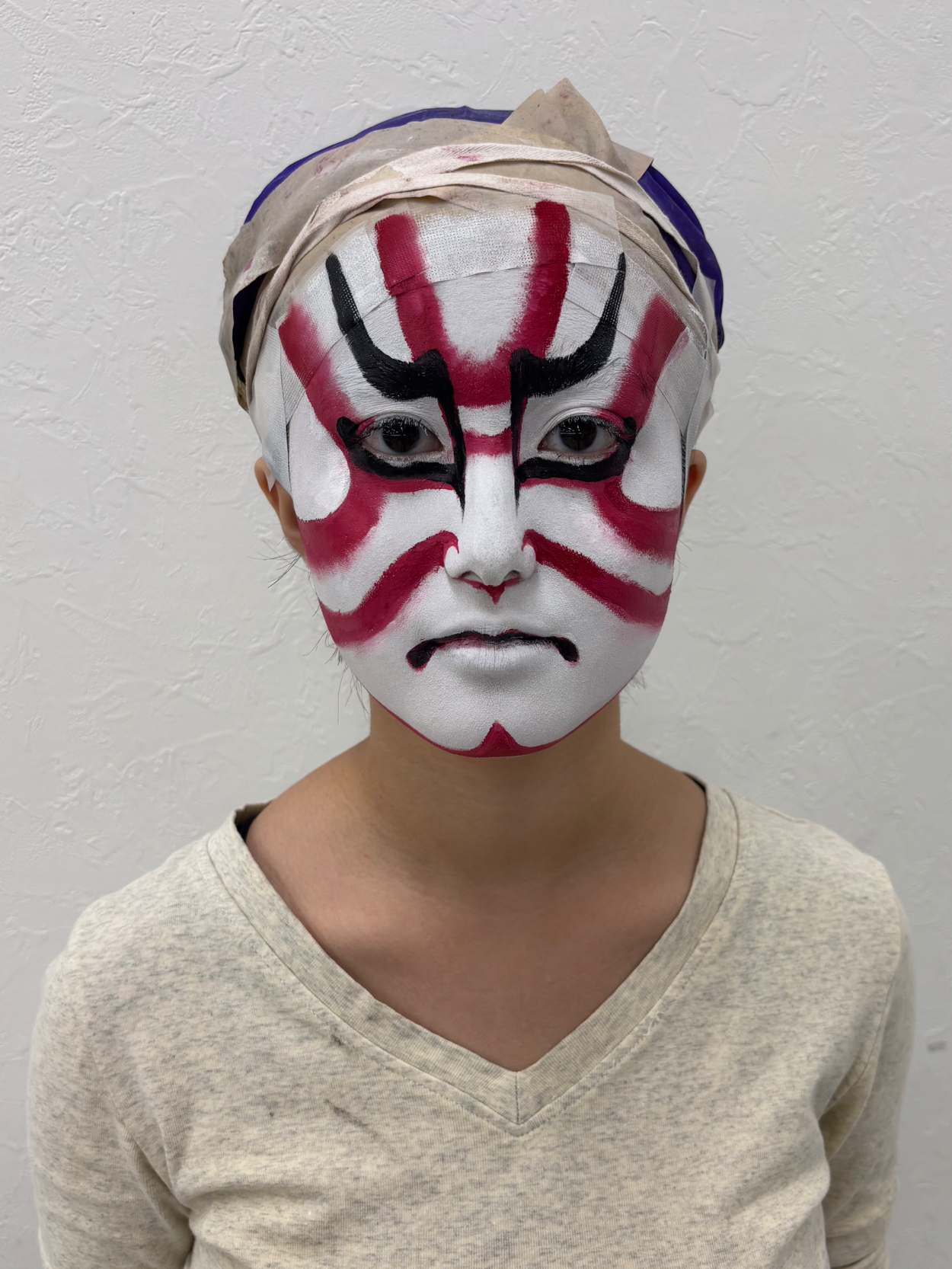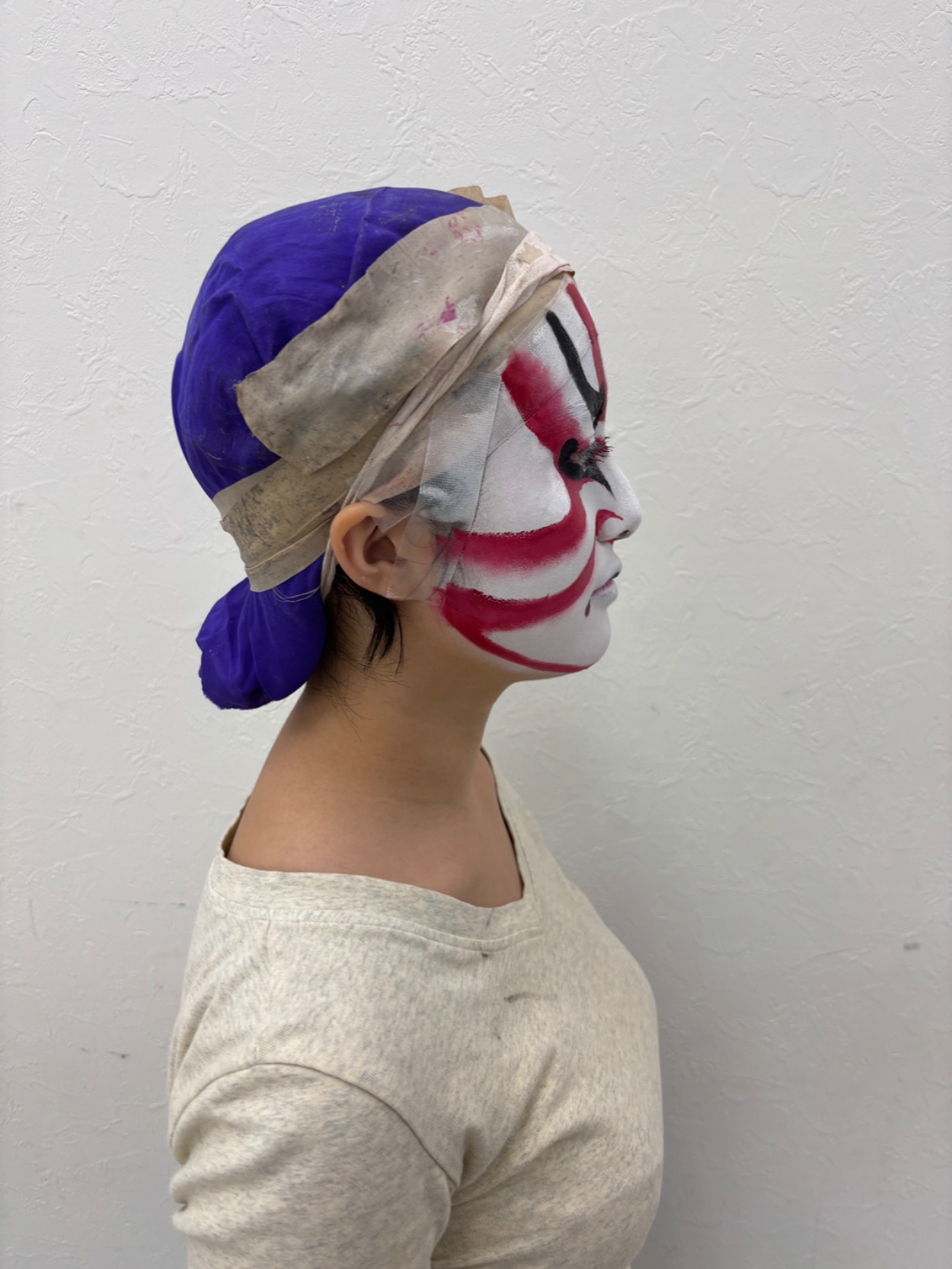 隈取のラインを左右対称に意識し、力強さを強調しました。色の発色と輪郭の明瞭さにこだわり、舞台映えする仕上がりを目指しました。