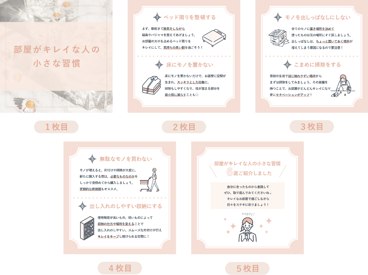 部屋をキレイにする小さな習慣を知りたい方が、読後に『やってみよう!』『これなら始められそう!』と思えるようなTIPSの紹介と、最後の5枚目で前向きな気持ちになれるような流れを意識し制作しました。