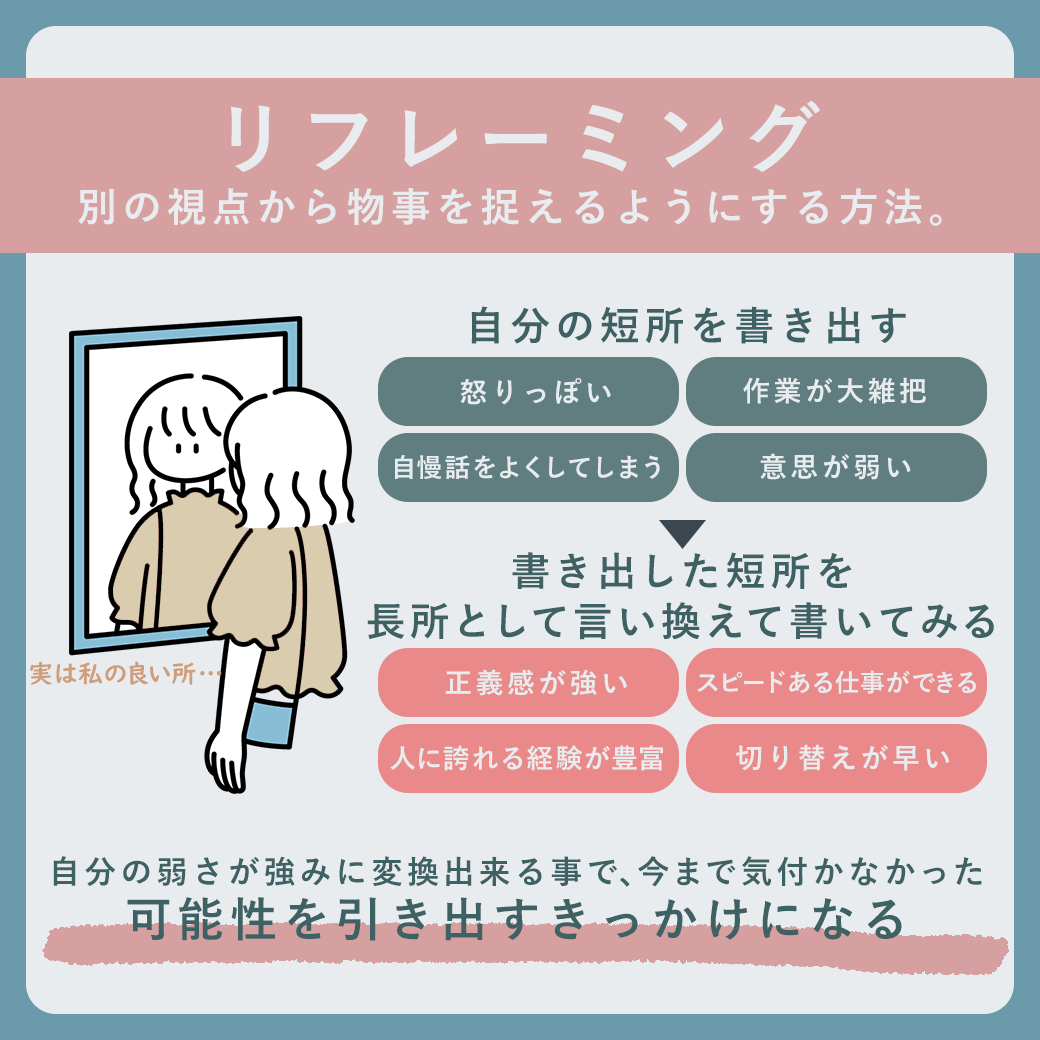 ▶”リフレーミング”別視点から物事をとらえるようにする方法。