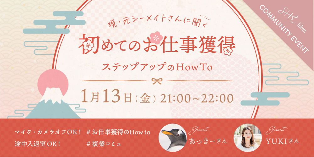 SHElikesで学んだスキルを活かしてお仕事を始めてみたいと考えているが、何から始めたらいいの?どうしたら続けていけるの?と悩んでいる方に向けて、お二人のゲストさんが実際にどのように初めてのお仕事を獲得し、どのようにステップアップしてきたかについてノウハウを教えていただくイベント。
