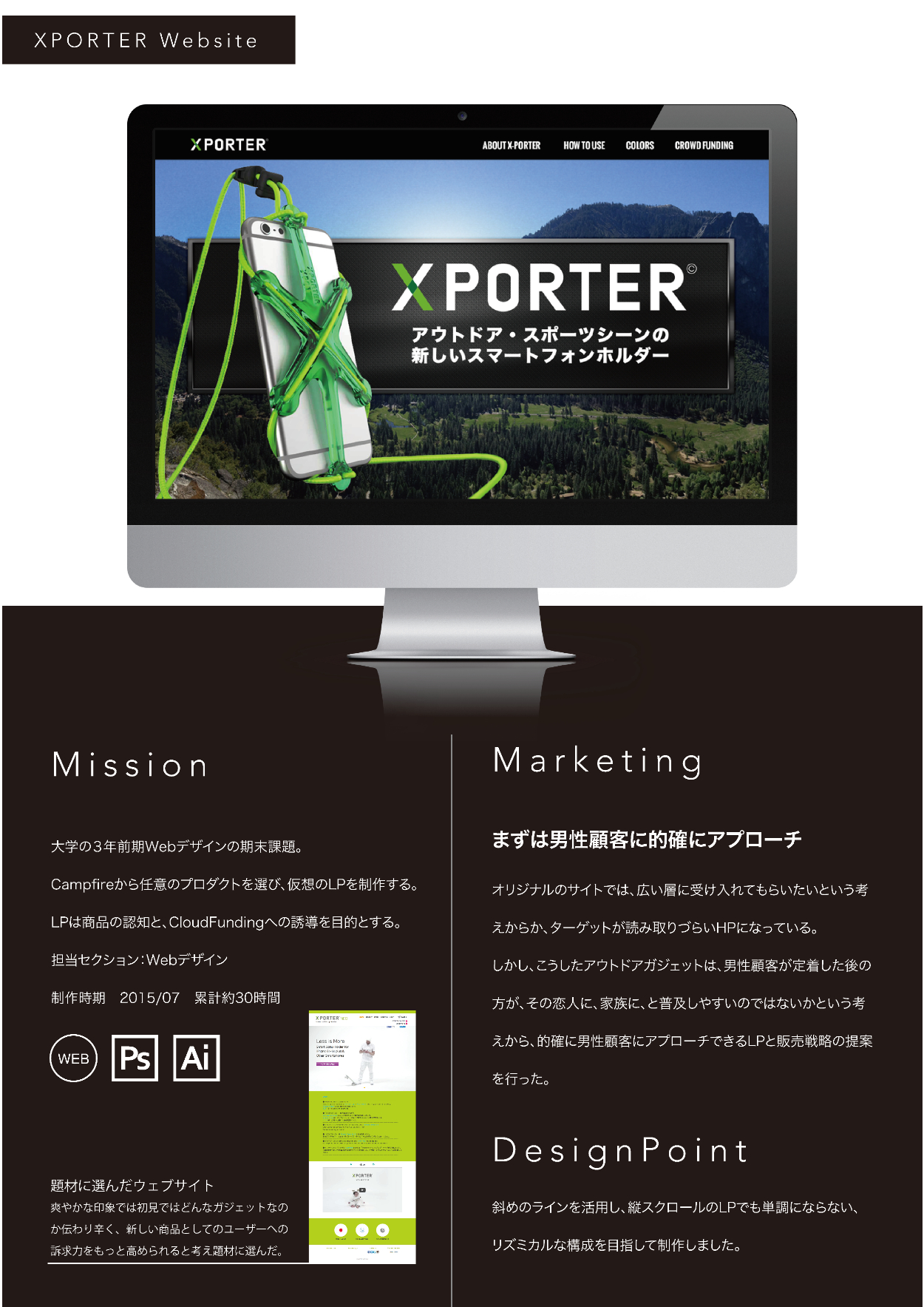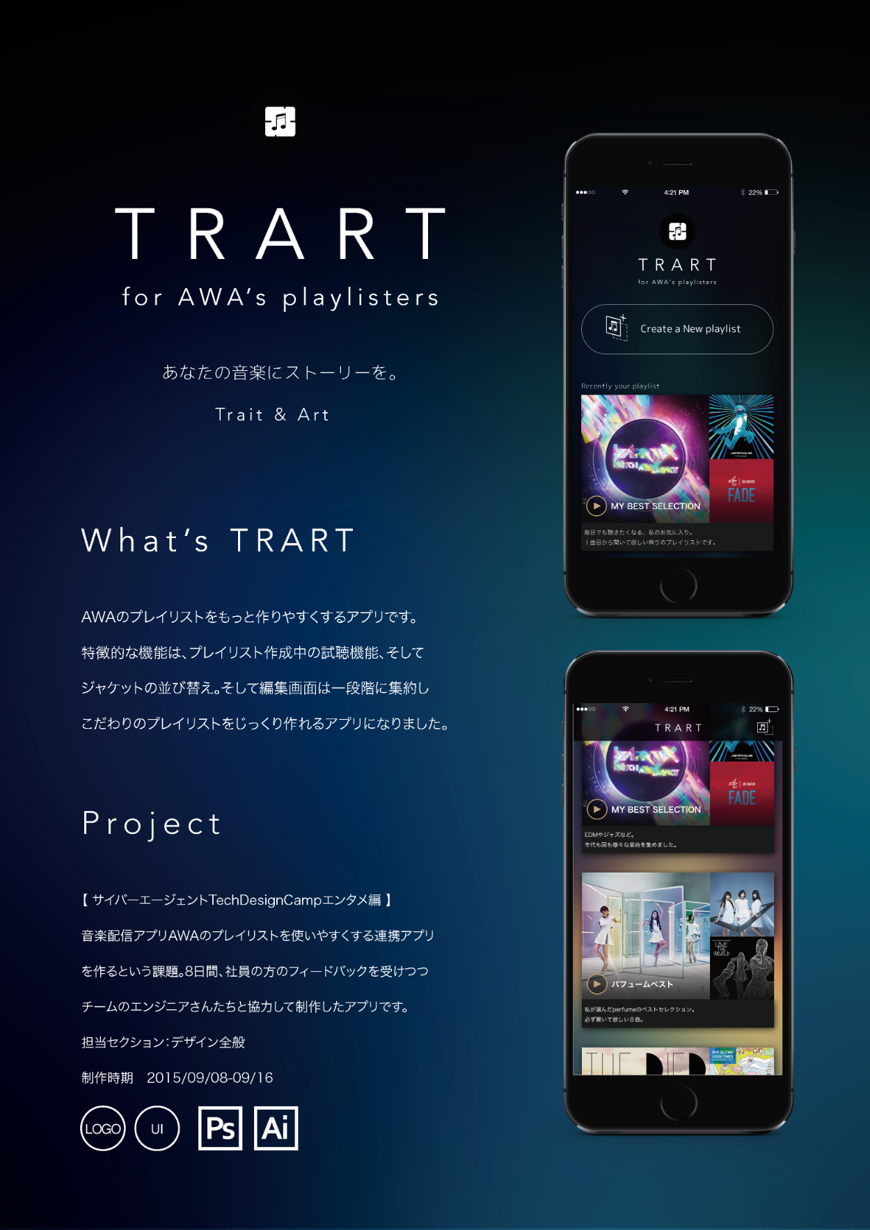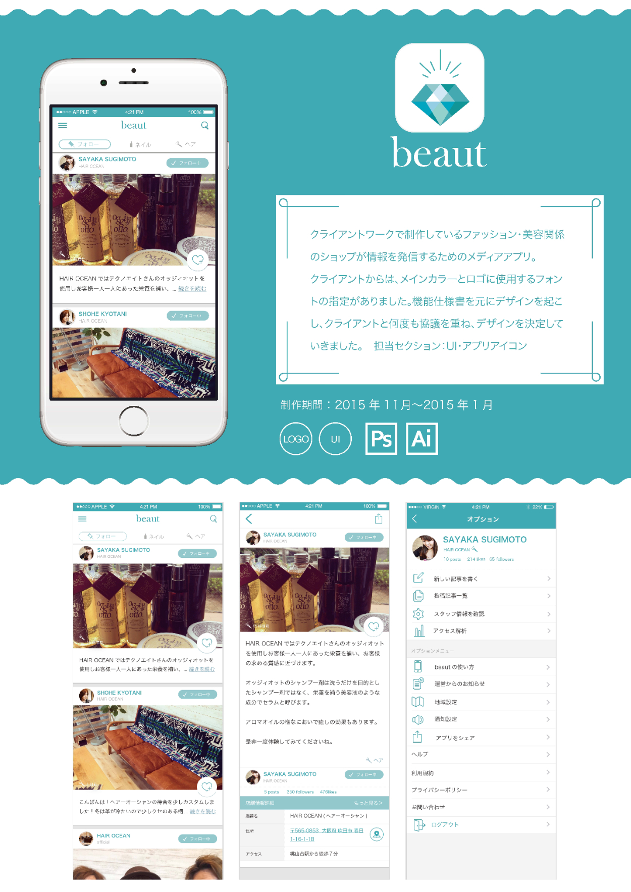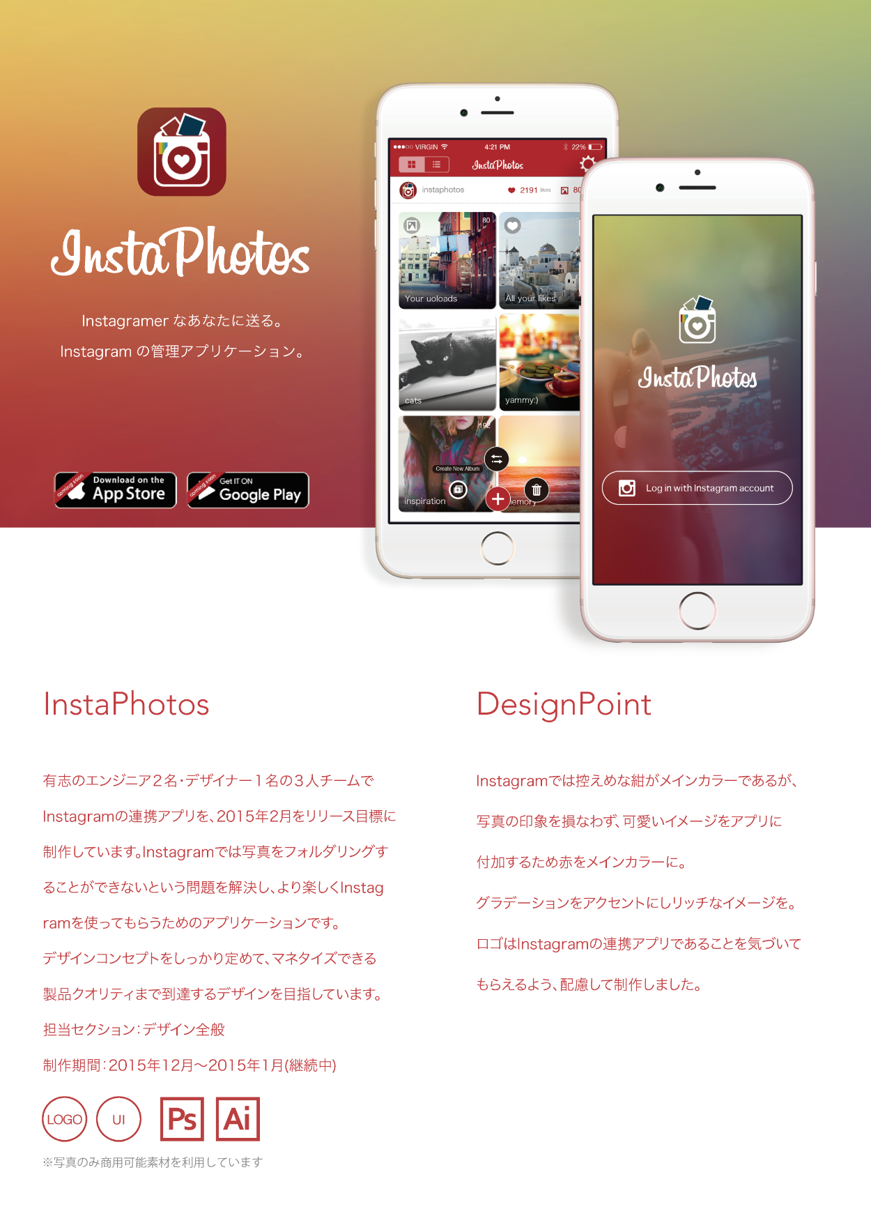 2015~2016年、就活中のポートフォリオから一部抜粋。デザイン作業は全て本人担当の作品のみ。(アプリ・Webの実装はチームのエンジニアが担当しています。)インターンやコンペでの作品・学校課題・クライアントワークが含まれます。