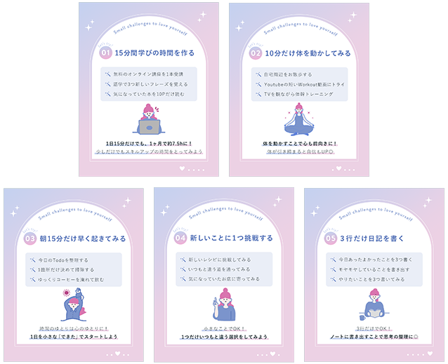 ・ターゲットである「面倒くさがりさん」でも気負わず取り入れられるよう、行動のハードルが低く、それでいて“自分を好きになる”きっかけにつながる小さなアクションを軸に内容を設計しました。