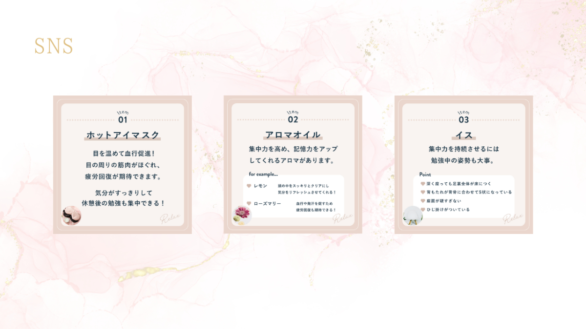 - リラックス、リフレッシュを意識し、シンプルながらも右下へ「Relax」のあしらいを配置。