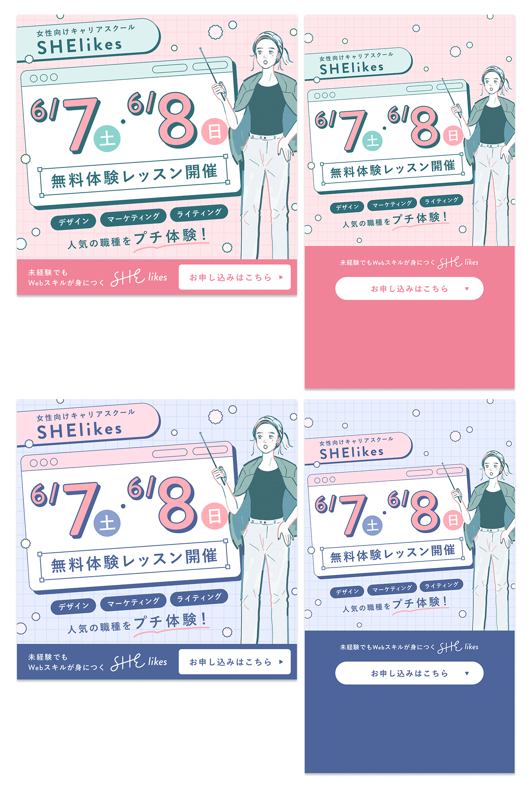 SHE株式会社様のサービス“SHElikes”のSNS広告バナー制作。 マーケティングチームからの要件とラフを元にデザインをしました。