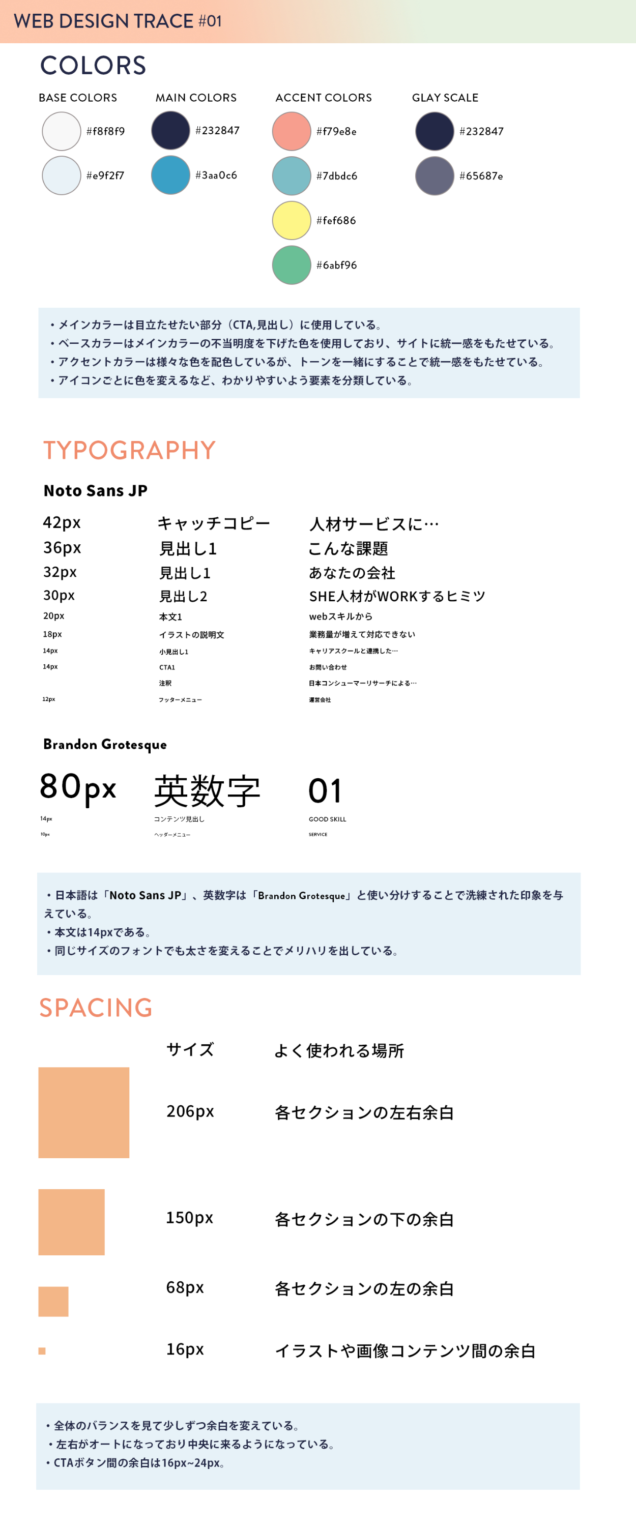 デベロッパーツールを使用して、WEBサイトの色・タイポグラフィ・余白をチェックし、スタイルガイドにまとめました。