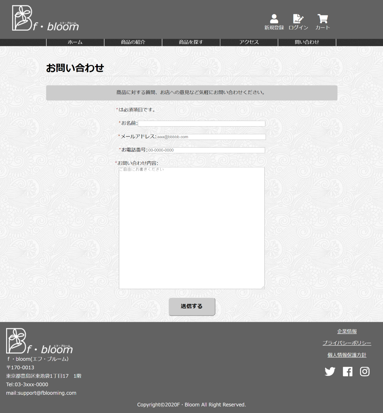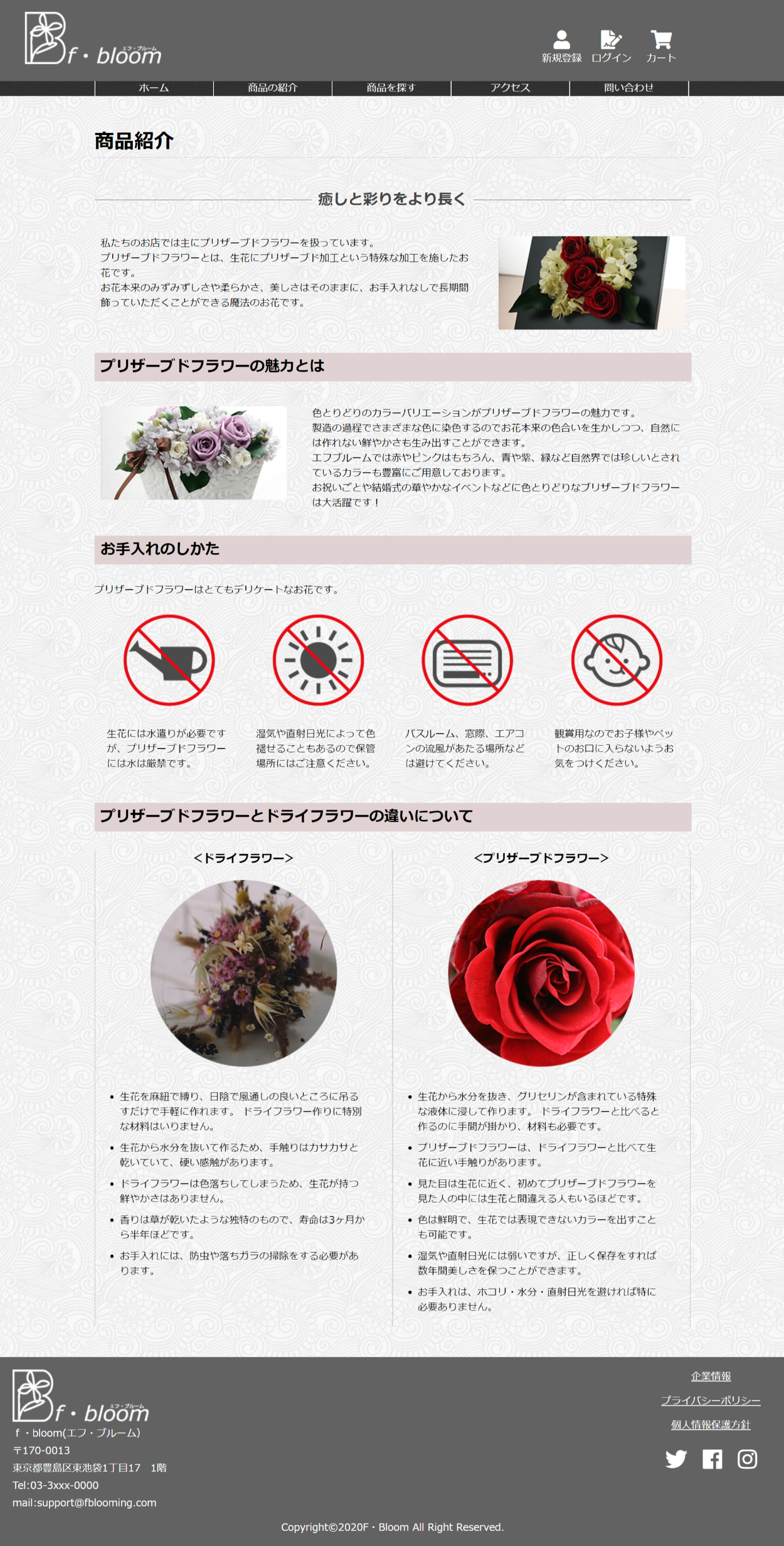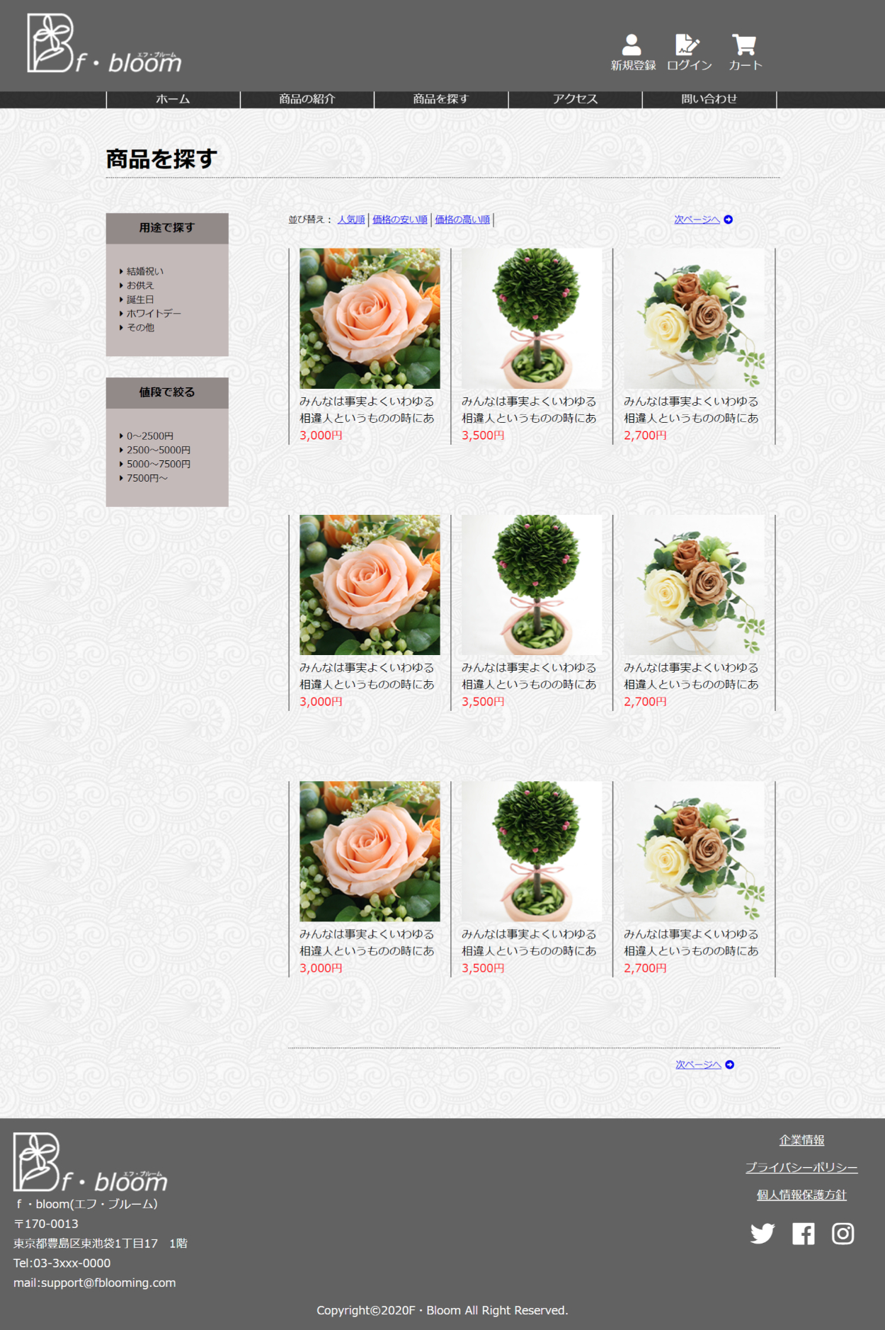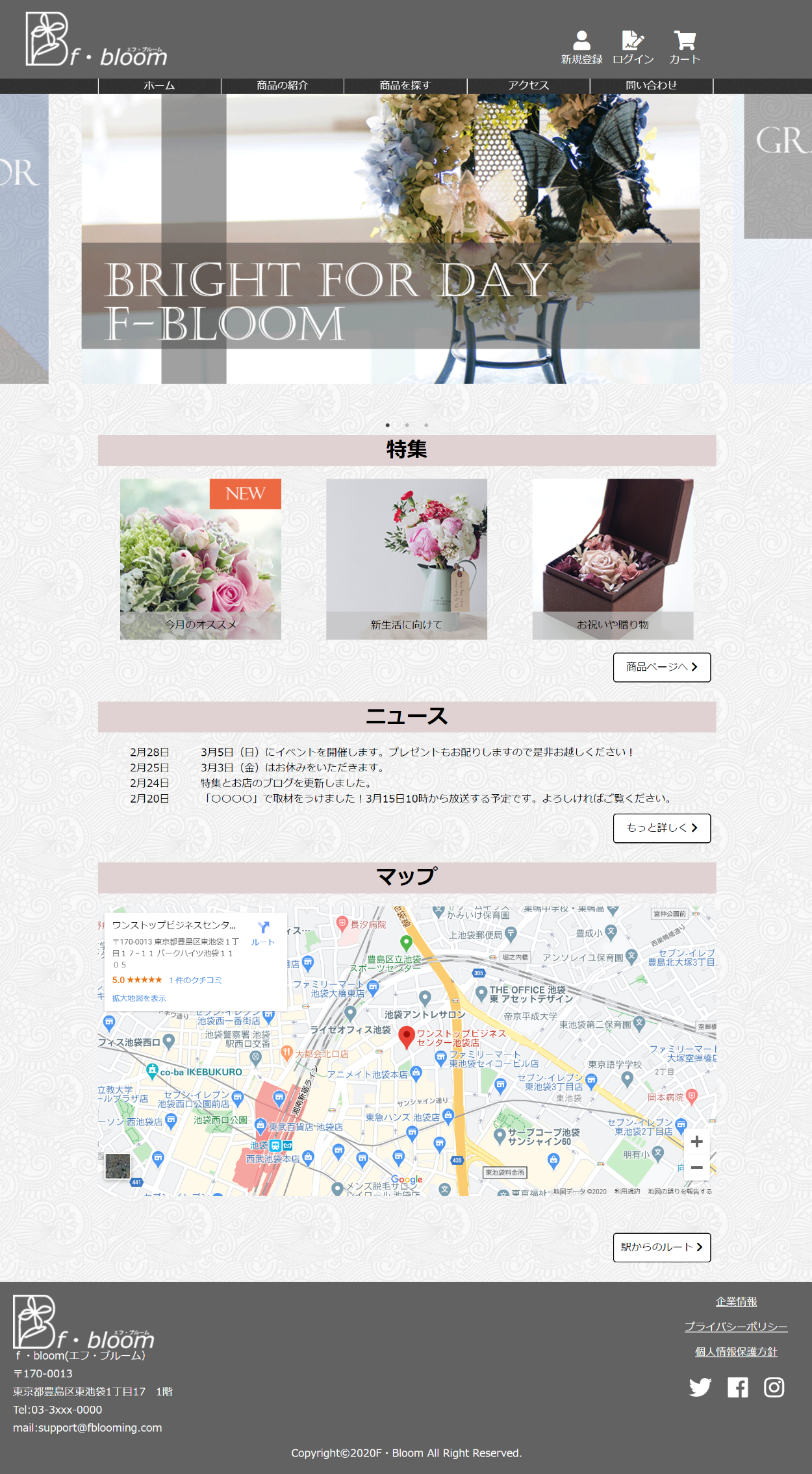 架空の花屋のPCサイト 丹 裕一 なし OVERVIEW 2020年1月~3月まで通ったwebデザインの職業訓練校の課題で制作したwebサイトです。 YEAR 2020 サイトの説明名前 エフ・ブルーム個人経営のお花屋さんで従業員数は5~6人程度ターゲットは普段あまりお花を購入しない20代~40代の男性贈り物などやお祝い事などでお花が必要になった時に利用してもらうのが目的男性客を意識して少し暗めの色を使いました華やかさよりも使いやすさを意識して作りました。トップページワイヤーフレーム完成形商品の紹介ページ商品の検索ページ問い合わせページ WEBSITE