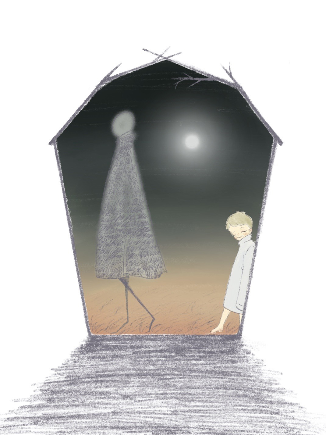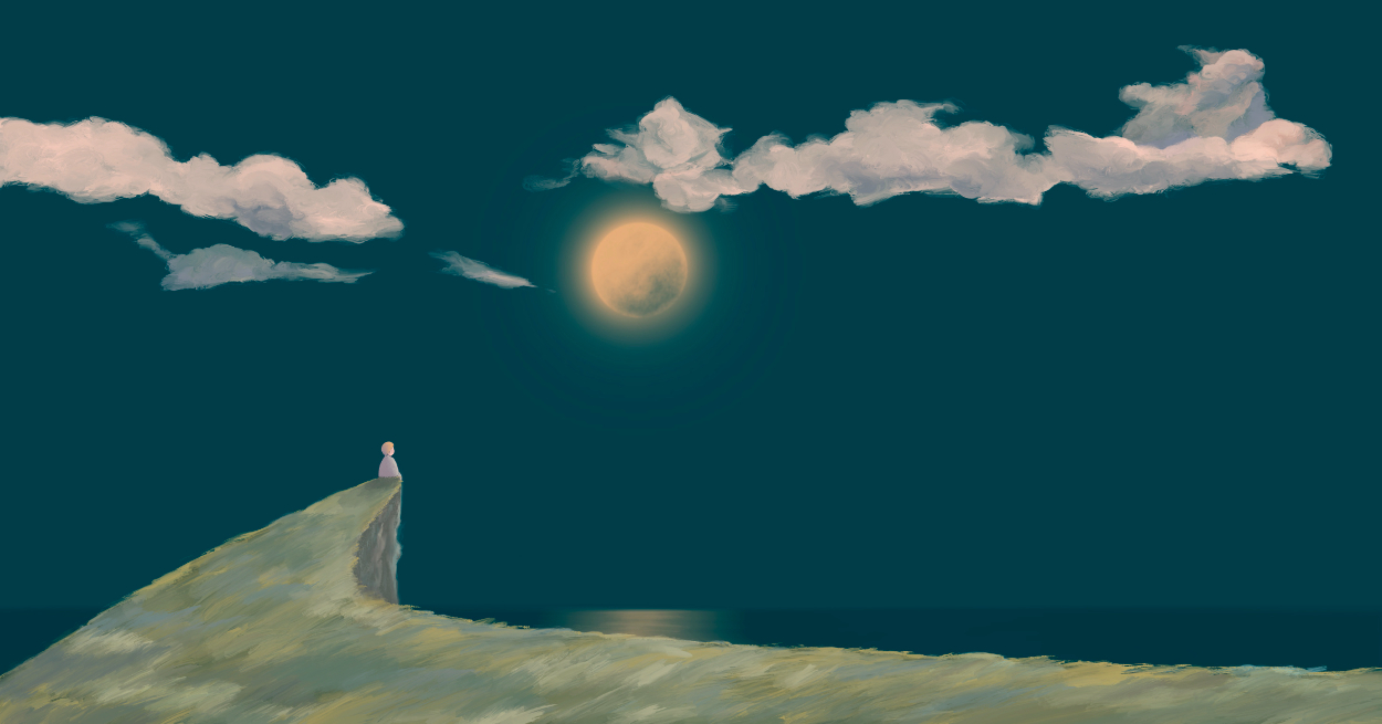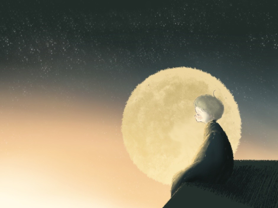 卒業制作に取り掛かる際、世界観を可視化するために作成。 夜の世界にひとりぼっちの小さな子。けれども、絵本のようなタッチと柔らかな色味で描くことを意識し、寂しさや冷たさよりも、温かみのある作品を目指した。