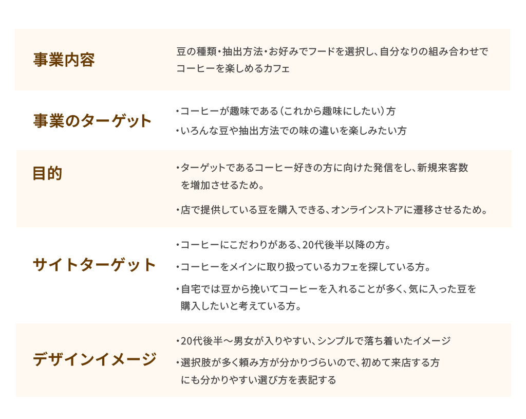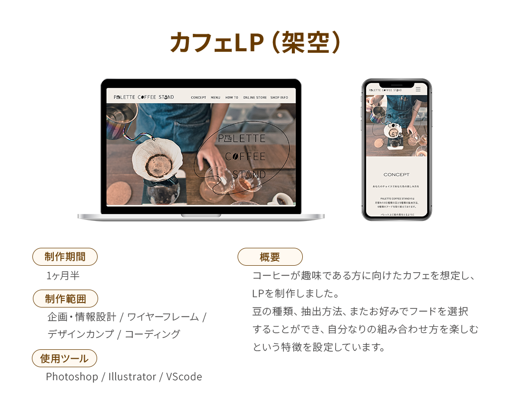 ターゲットの心を掴むよう、メインビジュアルにはコーヒーを淹れるスタッフの技術が伝わるような写真を採用。大きく表示したロゴは、カフェの特徴をモチーフとして自作しました。