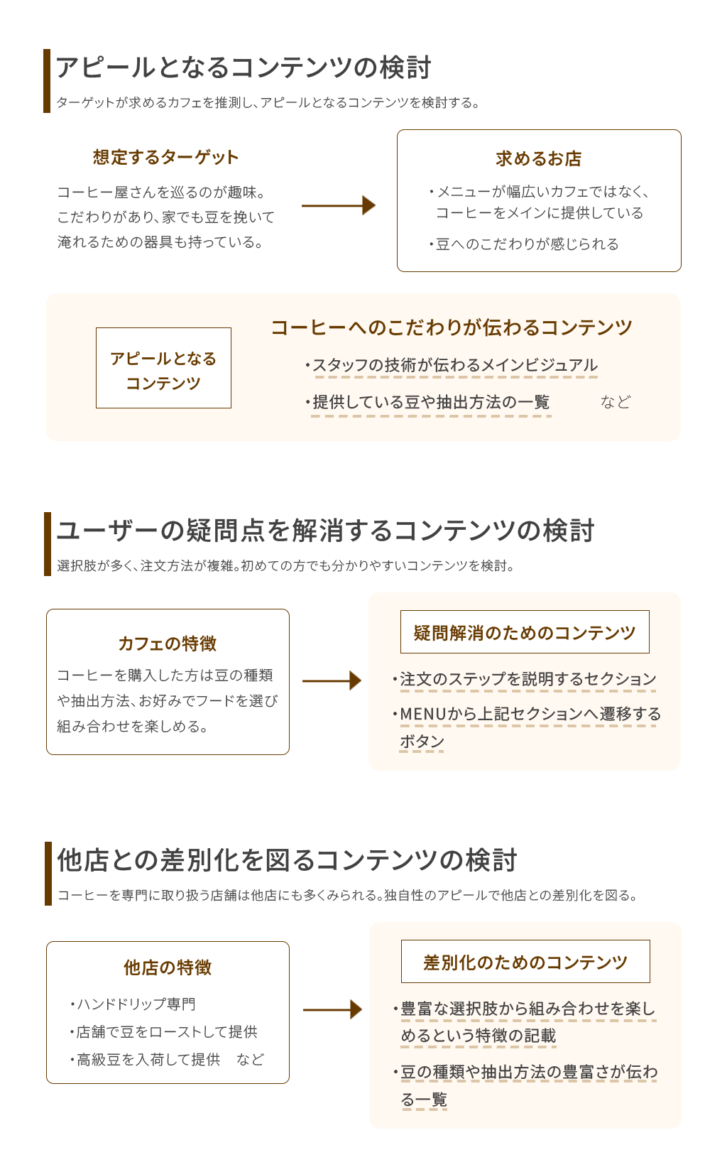 目的を達成するためには、どのようなコンテンツが必要かを検討しました。