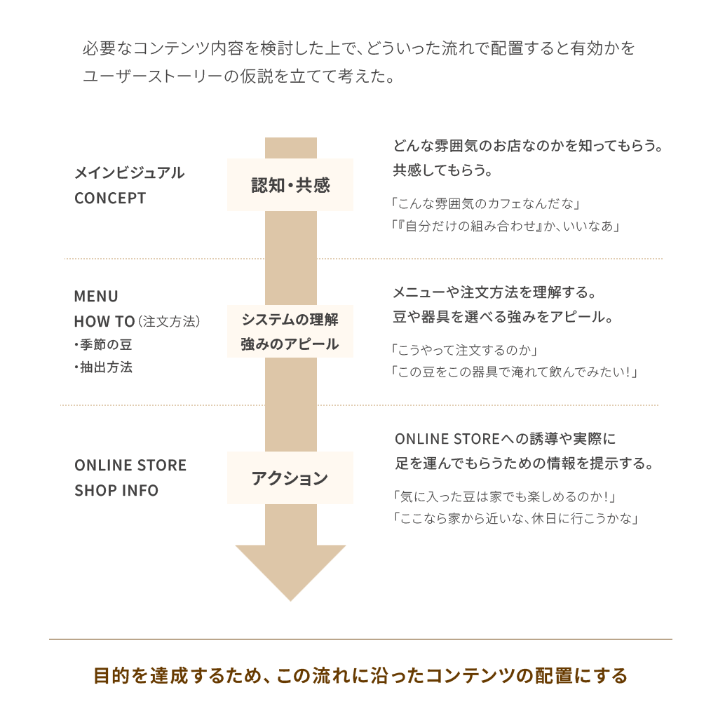 3−1で考えたコンテンツを、ユーザーに有効に伝えるにはどのような流れで配置するかを考えました。