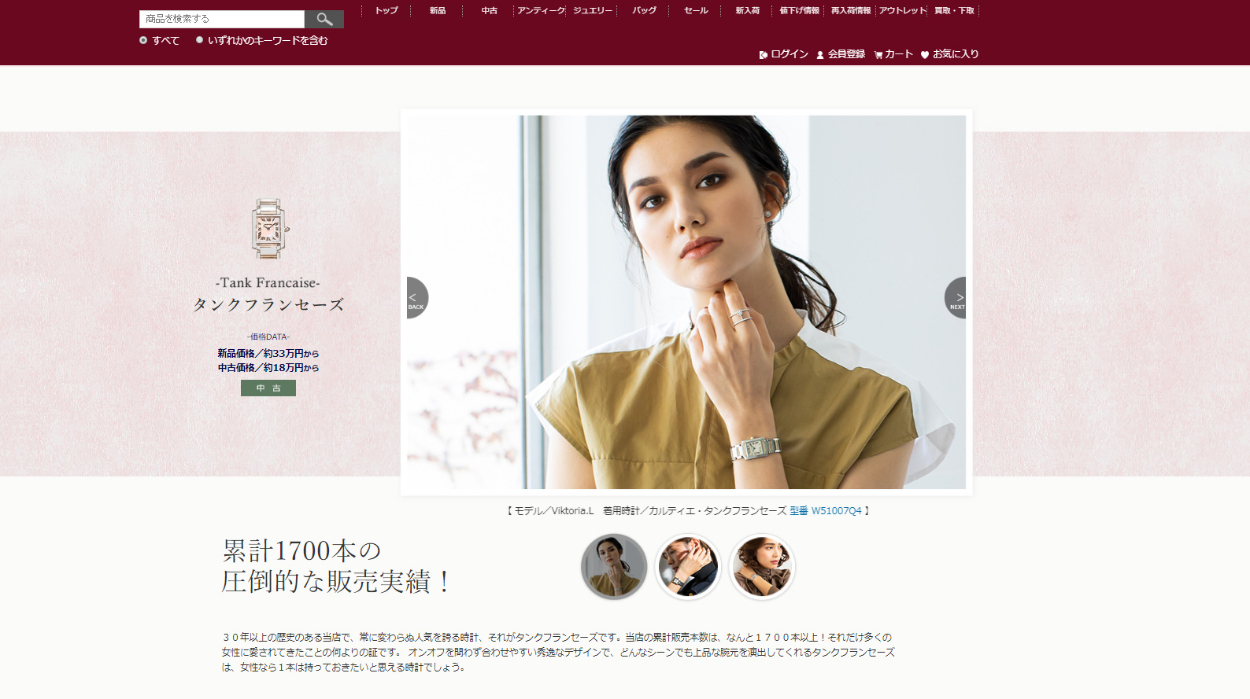 レディースの中でも特にロレックスとカルティエの中古・アンティークが人気であり、ロレックスのカメレオンやカルティエのマストタンクやタンクフランセーズなどを紹介しさらに売り上げを伸ばすために制作。