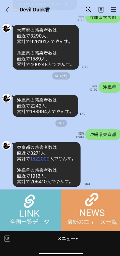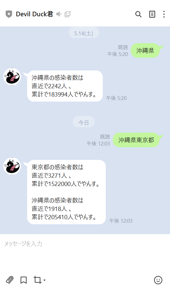 都道府県名を送信することでコロナウイルス感染者数(直近、累計)をお知らせします。