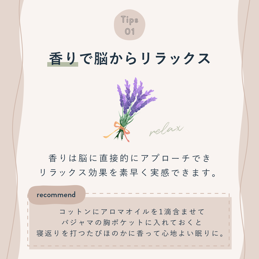 心地よさや睡眠の穏やかさを表現するため曲線的に、表紙とのトーンの統一感を意識した配色にしました。