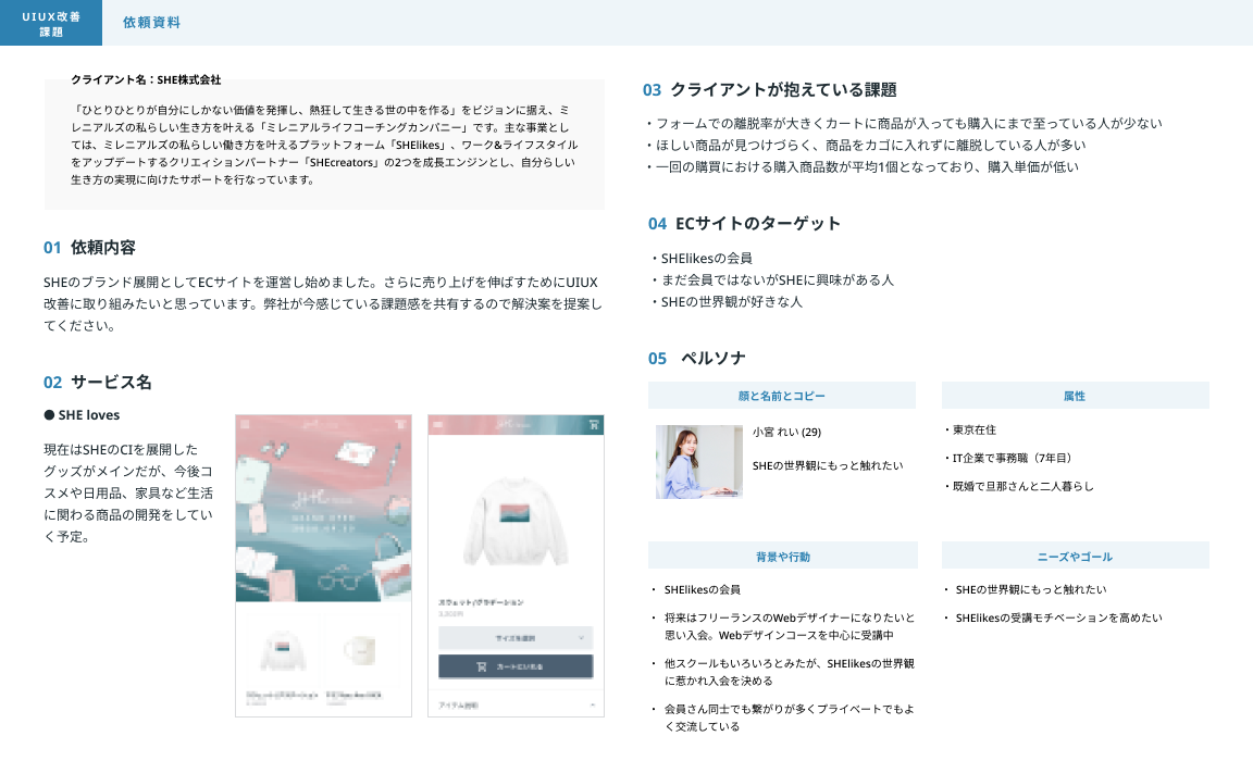 最初の要件で提示された課題に対して、その課題が発生する要因から仮説立て、それぞれに対する解決策を提示した資料を作成しました。