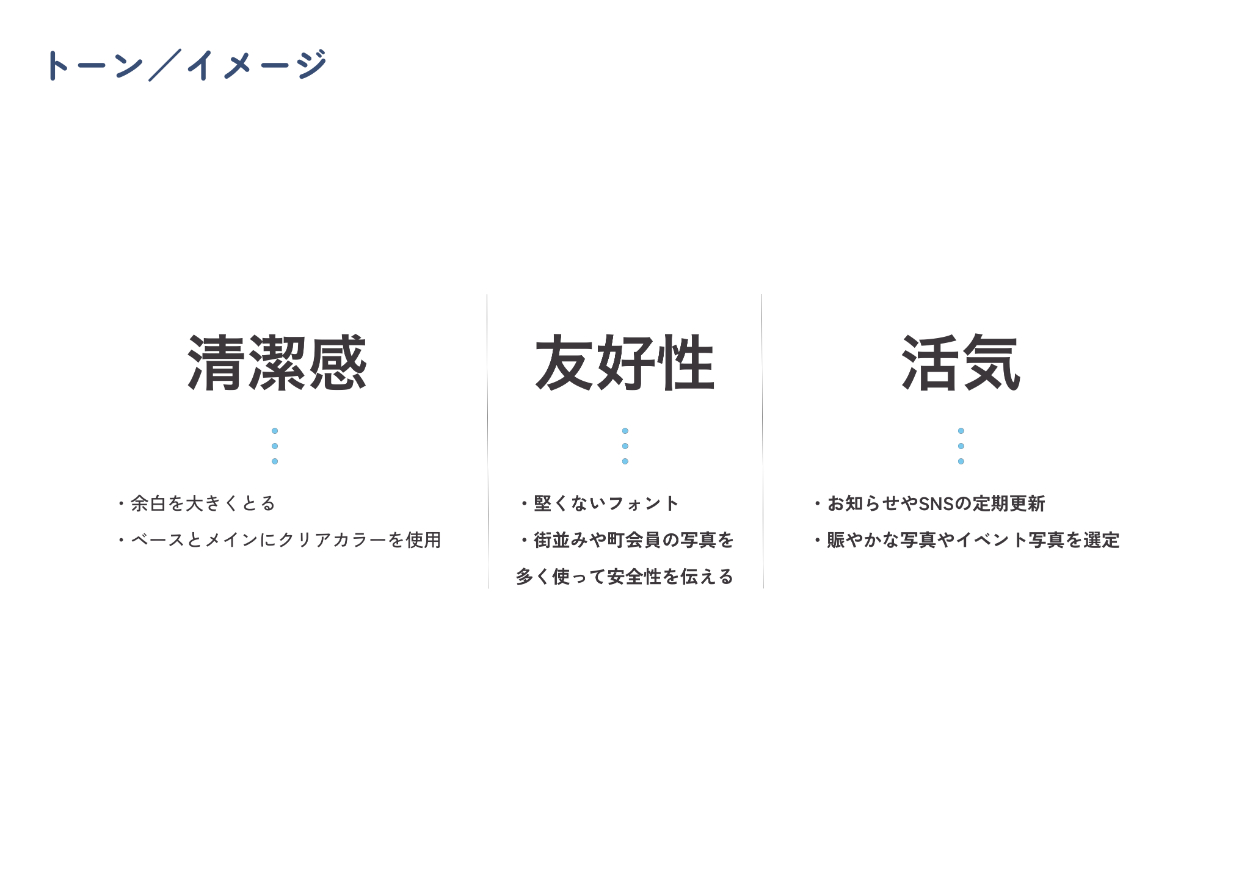 →サンシャイン=日の光の言葉の意味を噛み砕き、人の集まる・活気ある空の下をイメージして空色+差し色にオレンジを選定。