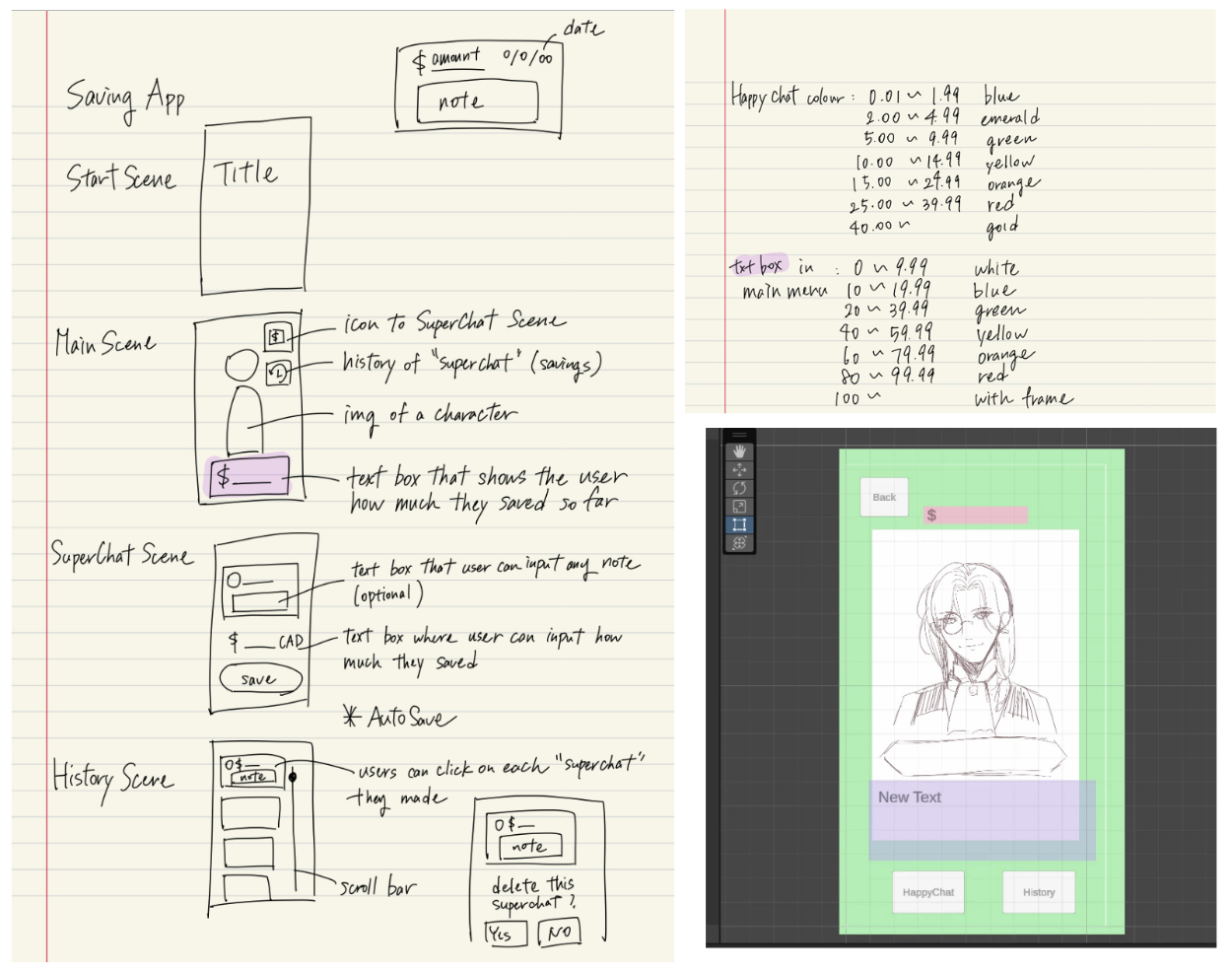 「推しへスーパーチャットを送った」という満足感をユーザーに与えるためにスーパーチャットのデザインを本物に寄せつつ、ノベルゲームを遊んでいるような感覚で節約を楽しめるように全体的にデザインをポップに仕上げました。