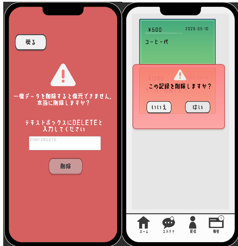 誤ってデータを削除してしまうのを避けるため、削除前にユーザーの明確な意思確認を行うステップを挟みました。視覚的にも注意を引くように危険色である赤を大胆に使いつつ、彩度を抑えることでアプリ全体の雰囲気とマッチするようにしました。