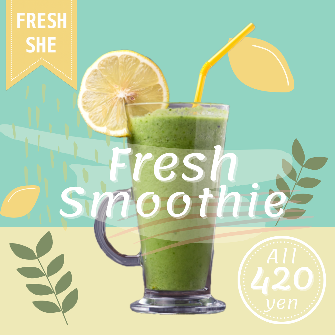 架空案件:フレッシュスムージー店からInstagramに掲載するバナーの制作依頼 ターゲットは、健康意識が高くナチュラル志向な20代の女性。(制作時間:3時間)