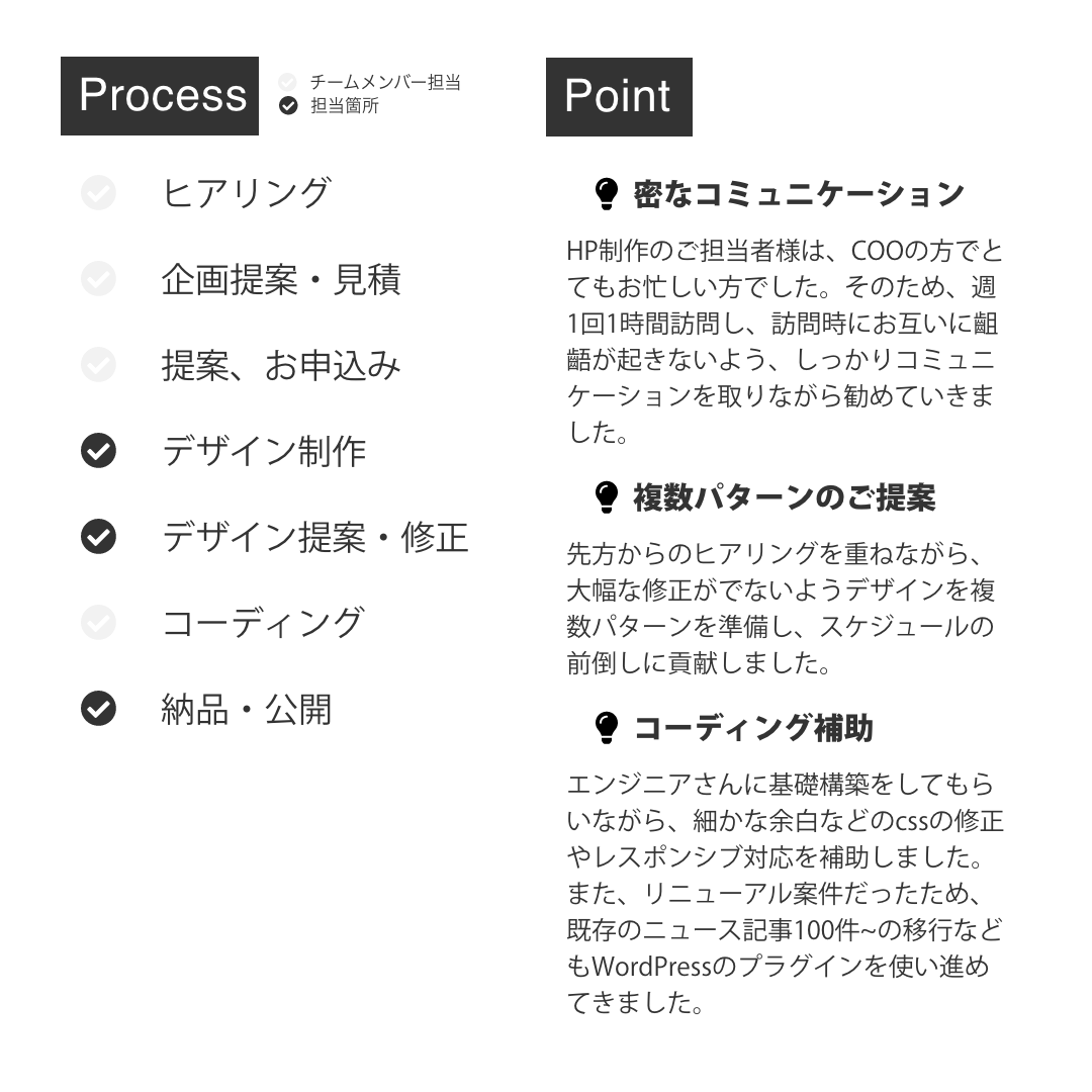 エンジニアさん制作後、レスポンシブ対応などでcss微調整やWordPressお引越し作業(記事入れ替え等)まで担当させて頂きました。