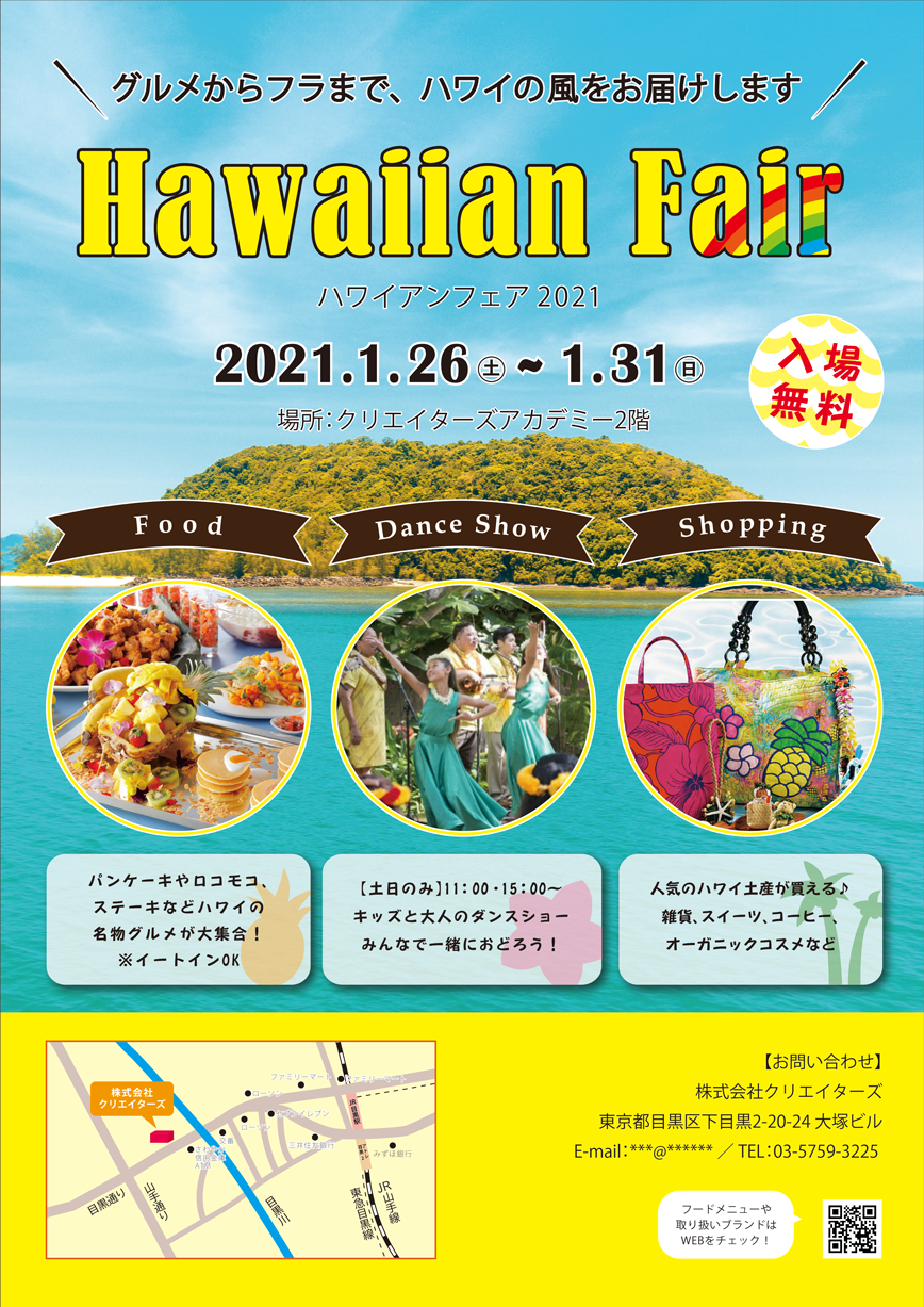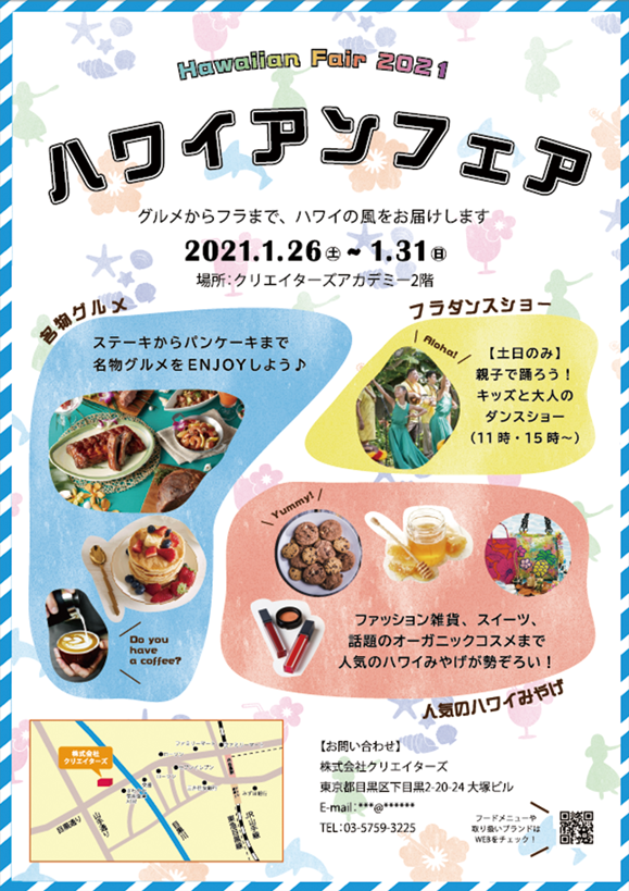 職業訓練校の課題として制作。 ハワイアンフェアの告知チラシと、パネルをデザインしました。 クライアントとターゲットを2種類設定して、それぞれ別のデザインを考えました。