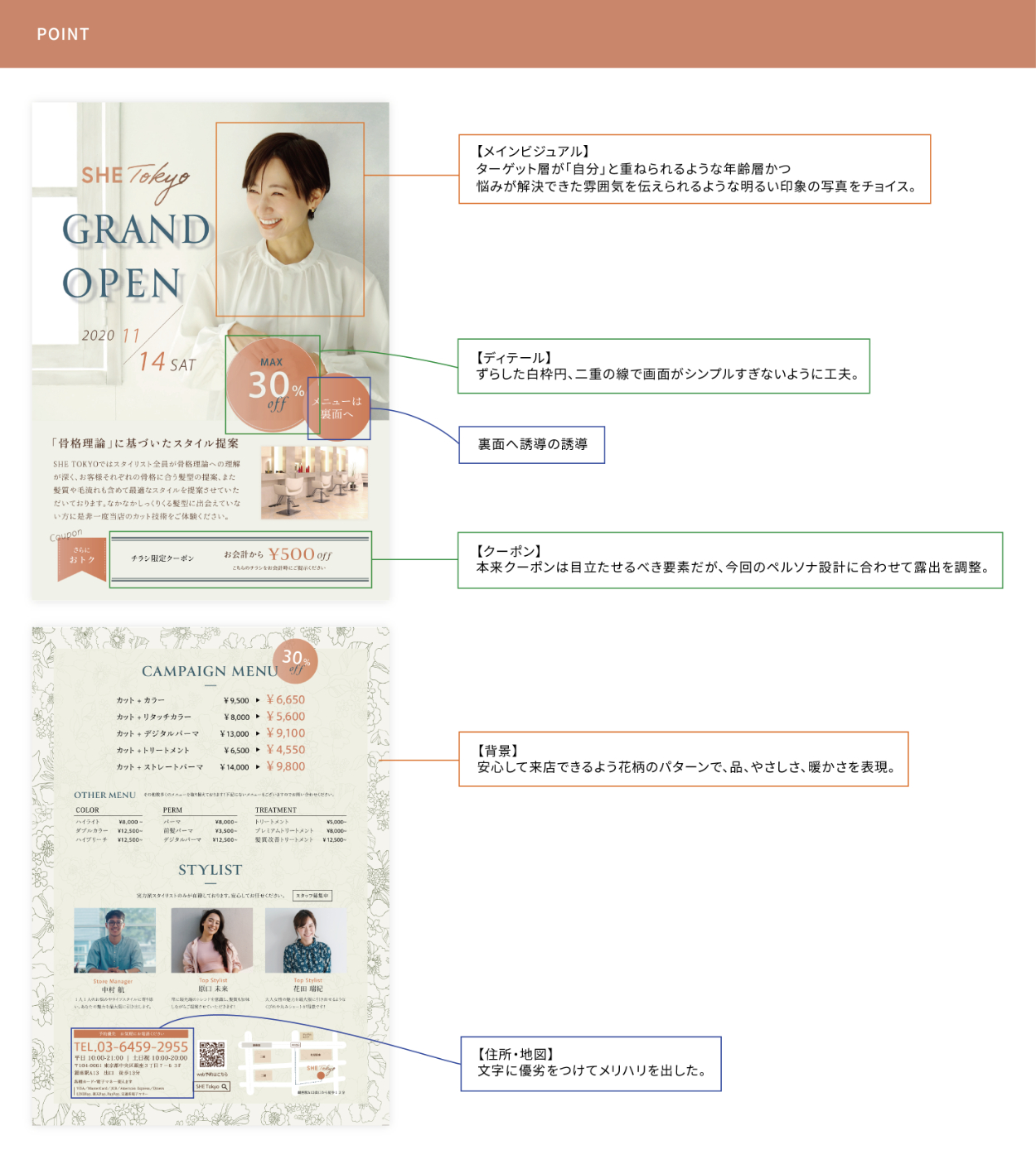 ペルソナ像から品を出しつつ、ポスティングなのでターゲットにしている人以外にも配るのため、まずは多くの方に来院してほしいので高級感すぎず、親しみやすさも出す。