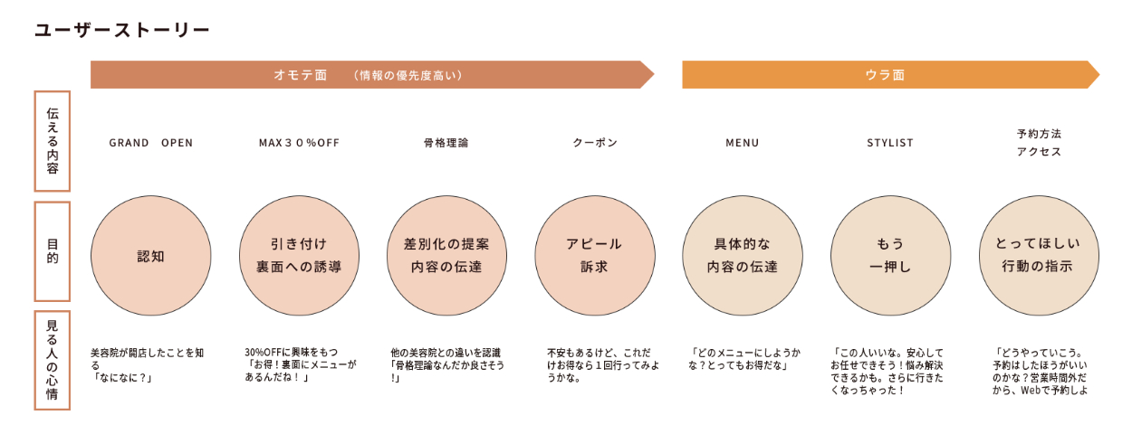 オモテ面に情報の優先度が高いものを配置。ユーザーストーリーを参考にZの視線の流れに沿って配置。