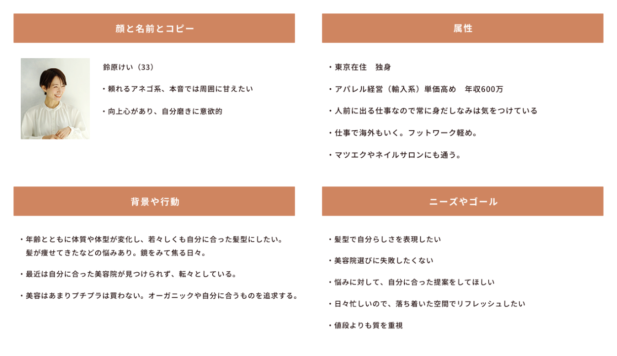 年収高めの30代の女性を想定。「少し高めの料金設定であっても確かな腕のスタイリストに担当してもらいたい」であることから、美容室1回あたり利用金額が高めである働いている30代の女性を想定。※「15~69歳男女の美容サロン利用実態」を参考