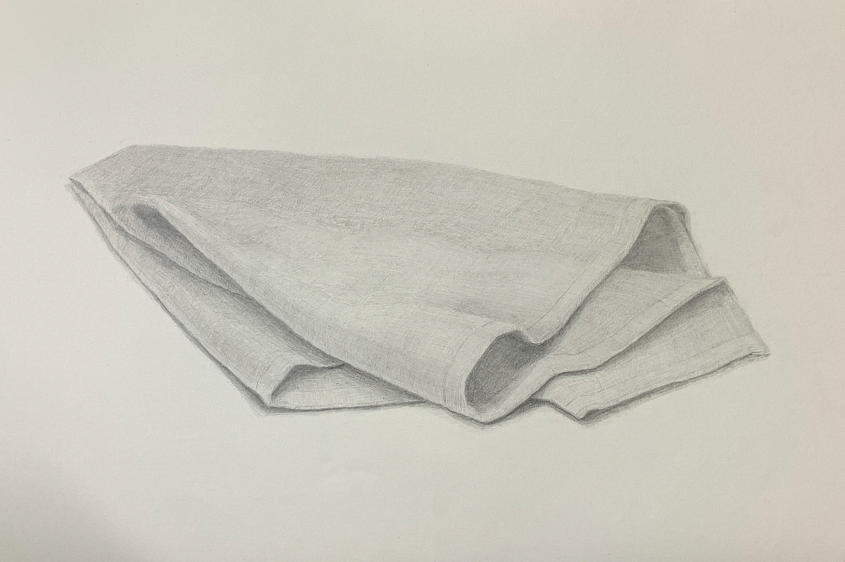 デッサン/布 Mai Takaoka 布の複雑な形状や光の反射を観察しながら、布の張り・柔らかさと重なりによる陰影の深さを描きました。素材の質感を鉛筆のタッチで丁寧に表現することで、静かな存在感を持つ一枚に仕上げています。使用ツール:鉛筆