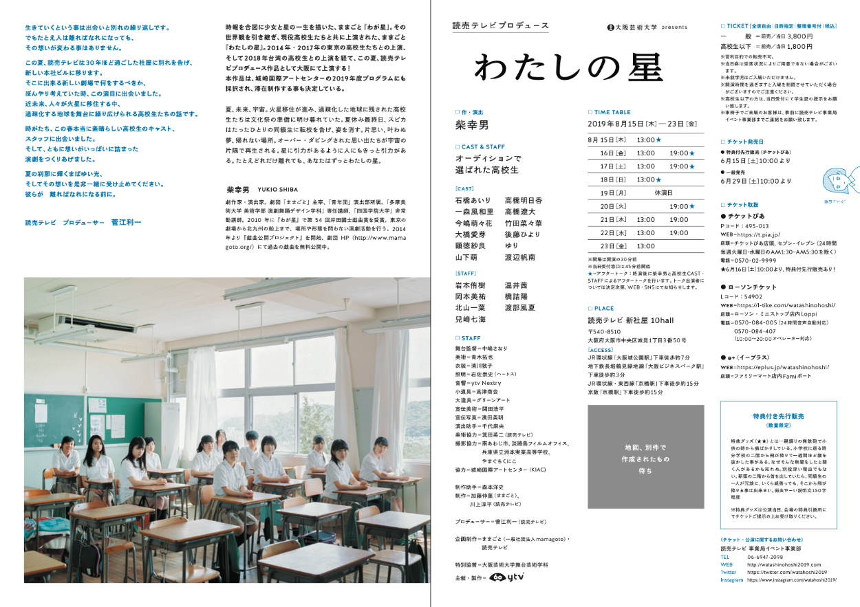 読売テレビプロデュース 『わたしの星』 Hiroshi Morimoto OVERVIEW 2019年8月 読売テレビプロデュース 『わたしの星』の制作助手として参加 YEAR 2019 大阪芸術大学presents読売テレビプロデュース 『わたしの星』 作・演出:柴幸男出演:オーディションで選ばれた高校生日時:2019/8/15[木]~23[金]会場:読売テレビ新社屋10hallSNS-linksTwitter Instagram Tumblr YouTube(写真:衣笠名津美)(撮影:濱田英明)