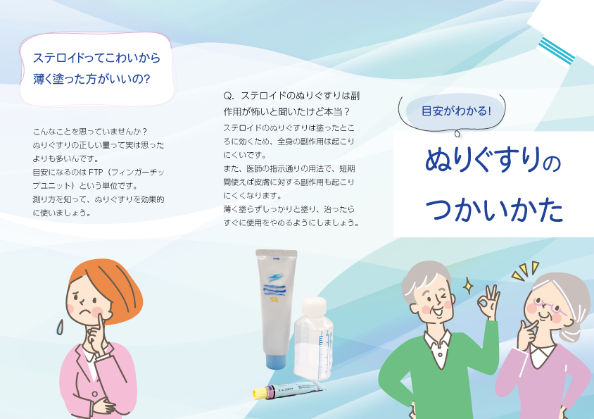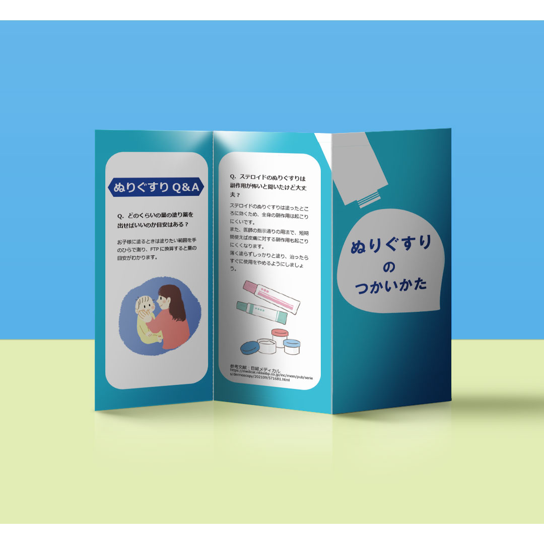 患者さんからの「ステロイドは怖い」という声や、医師からの「量を少なく塗ってしまい治療の効果が得られなくなる」などの声を受け、ぬりぐすりの正しい使い方を啓蒙するためのパンフレットを制作するという想定で作成いたしました。「ぬりぐすりって思ったよりも多く使うんだ」「FTP(フィンガー・チップ・ユニット)で測ると簡単」ということを伝えたいというのがコンセプトです。