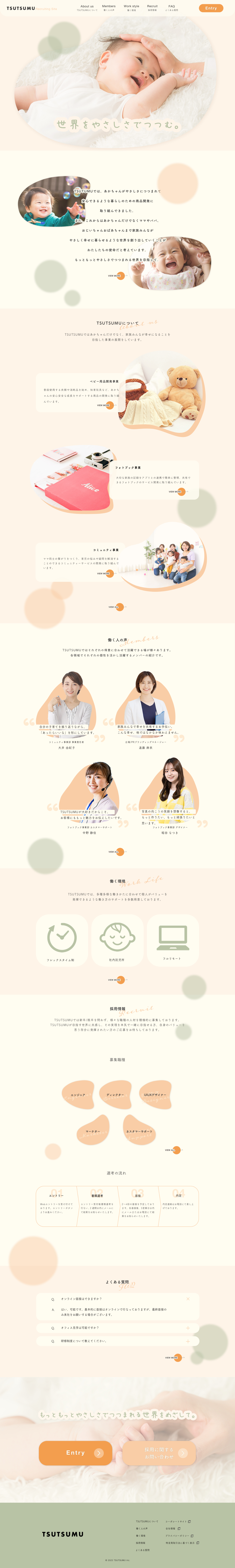 まず冒頭でTSUTSUMUがどんな会社なのかを知り(理念、事業概要)、次にどんな人がどんな思いを持ってどんな環境で働いているのかを知ってから、より具体的な採用情報とアクション(エントリー)を表示することで、TSUTSUMUの世界観に共感した人のエントリーを促します。