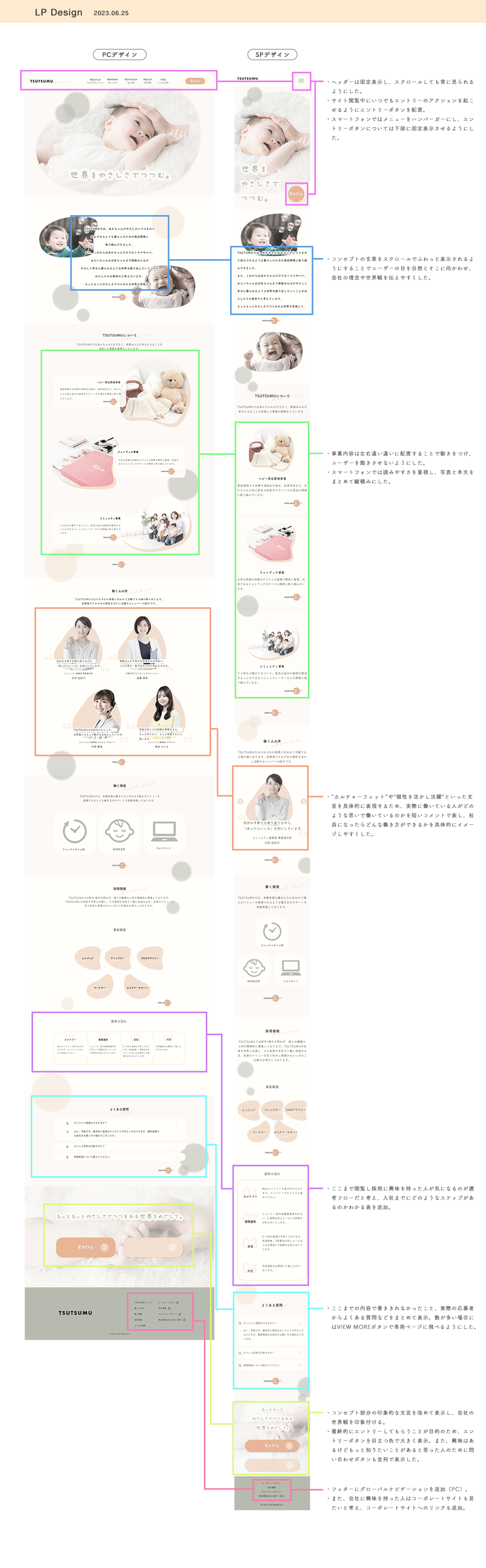 “TSUTSUMUの世界に強く共感する人”および“カルチャーフィットしている人”がターゲットのため、大きな枠から始めて少しずつ具体的な内容へ移行させ、LPを通しTSUTSUMUの世界へ入り込んでいくイメージで作成しました。